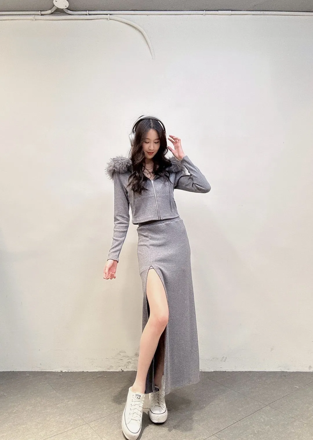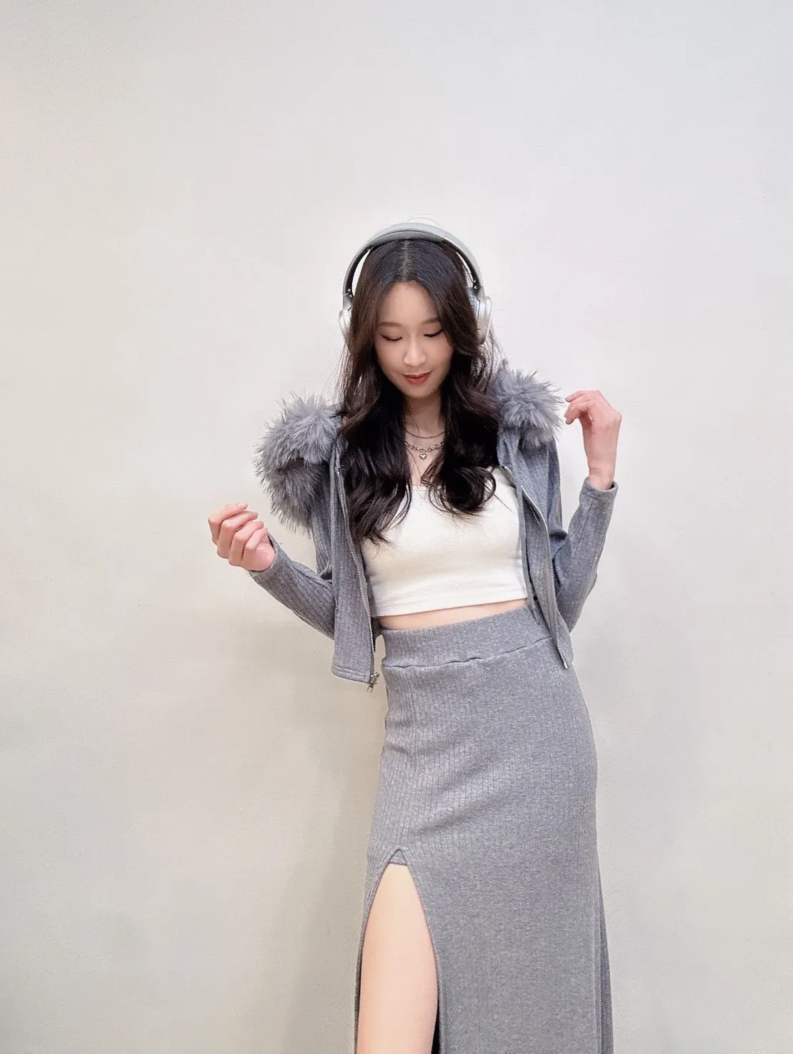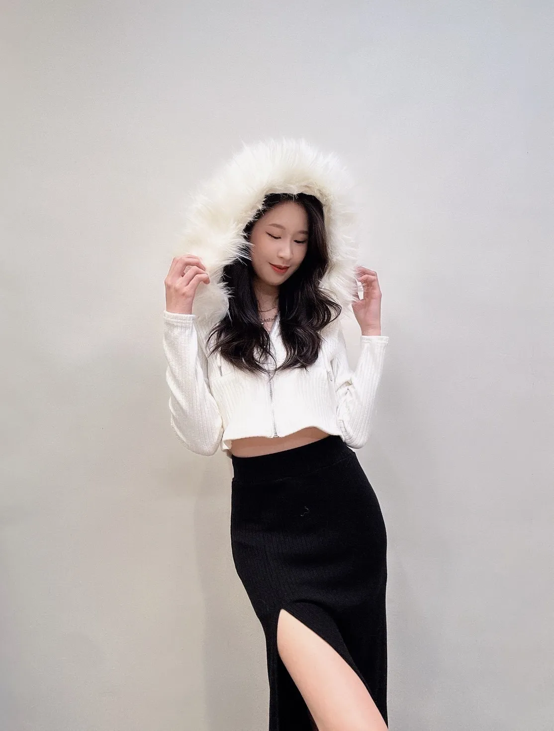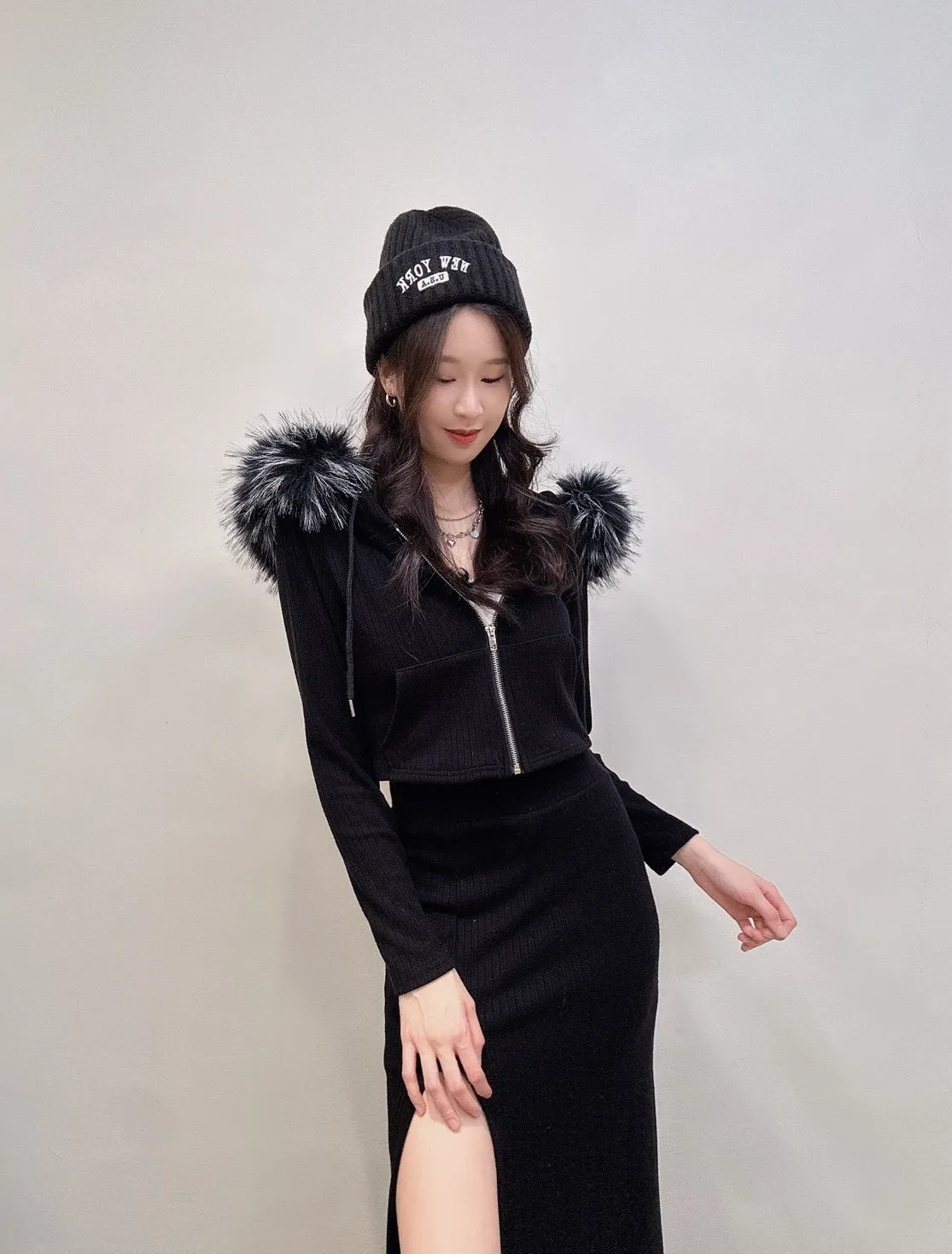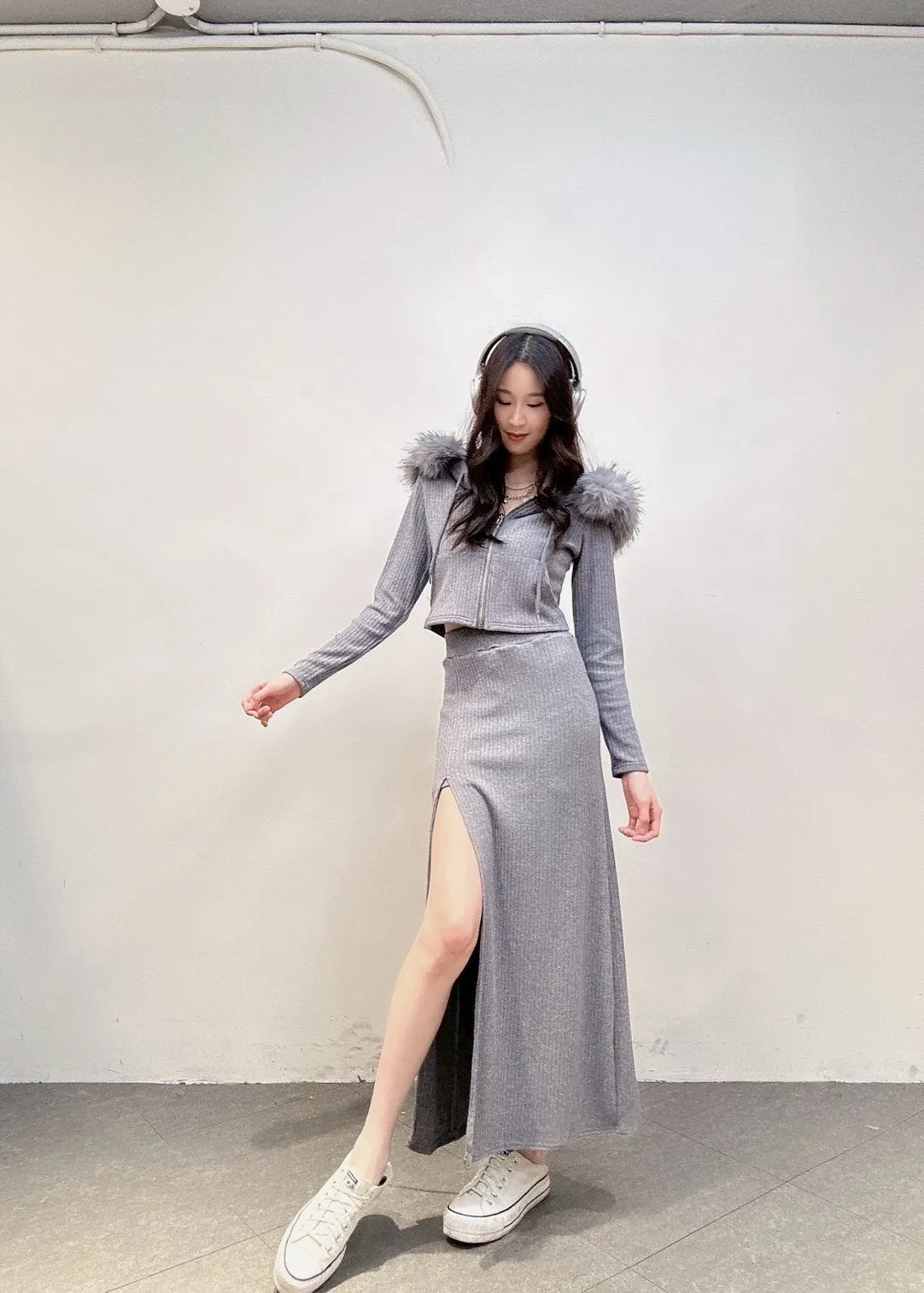 #02134 冬季大蓬蓬毛連帽套裝|短版坑條上衣+開岔長裙