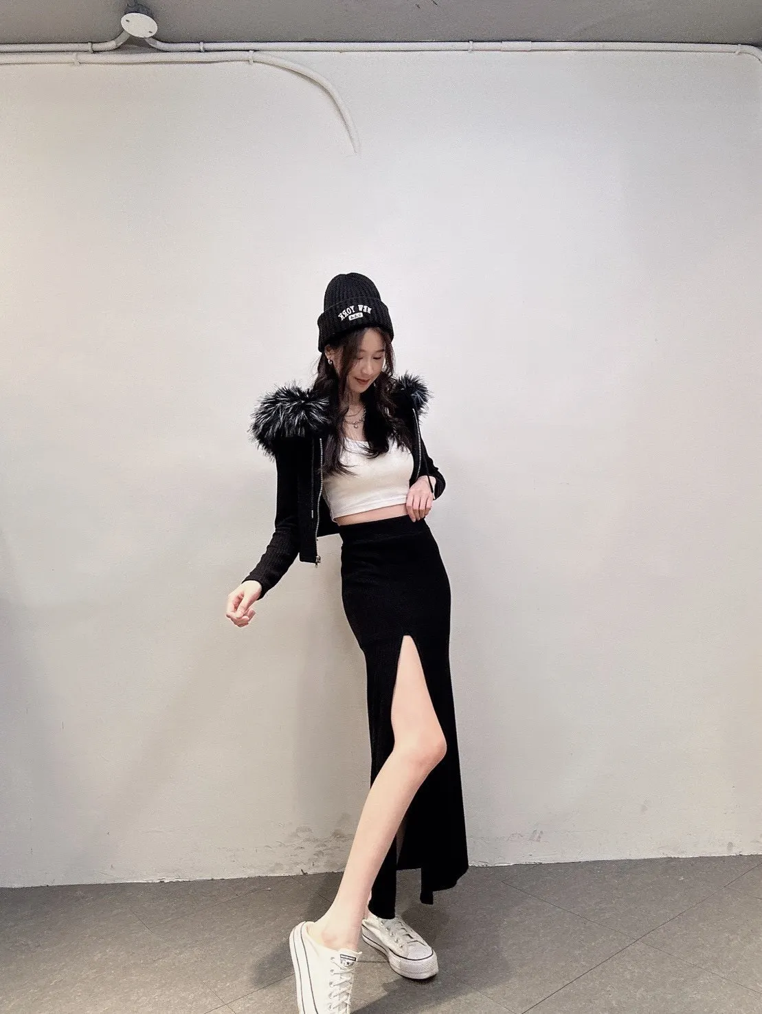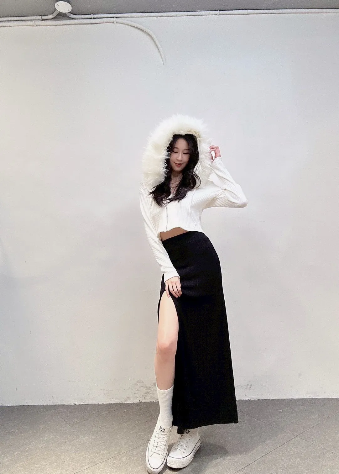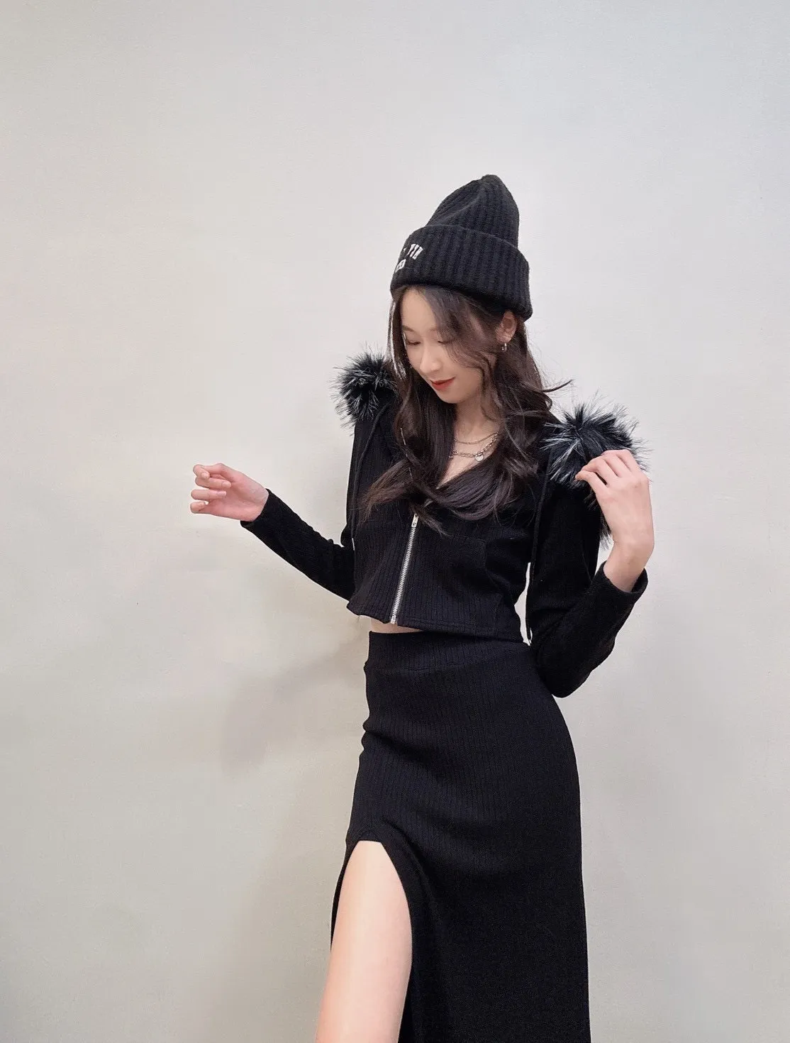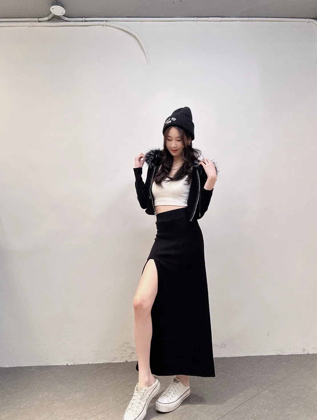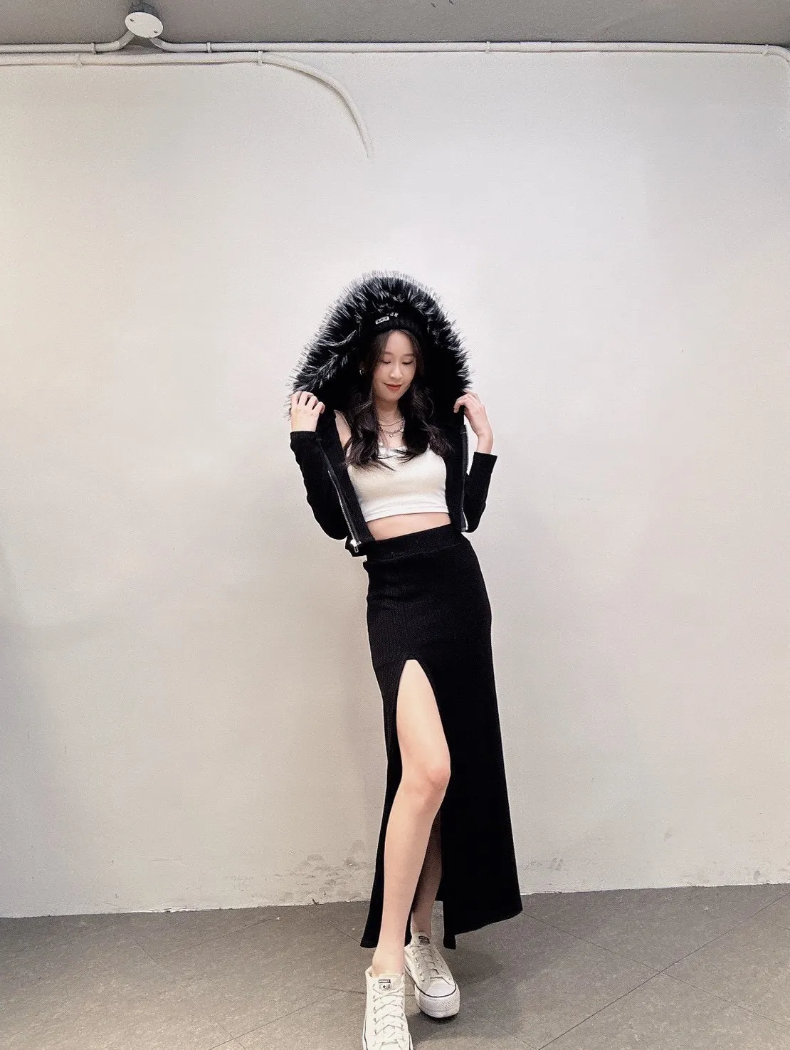 #02134 冬季大蓬蓬毛連帽套裝|短版坑條上衣+開岔長裙