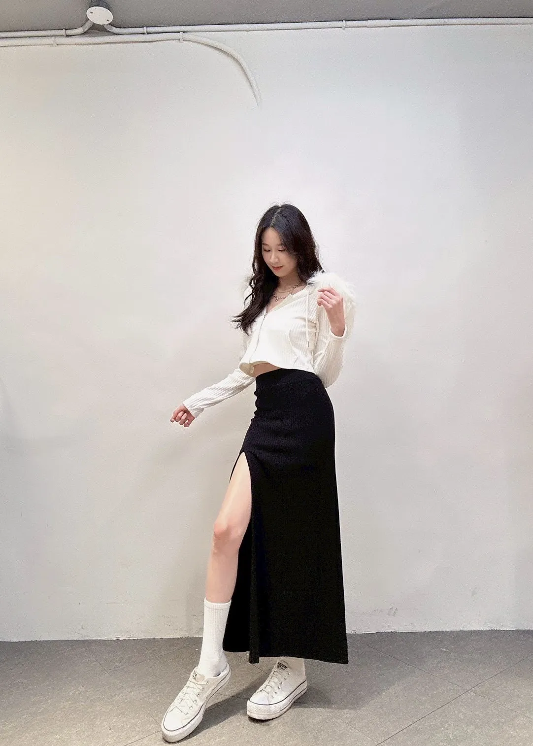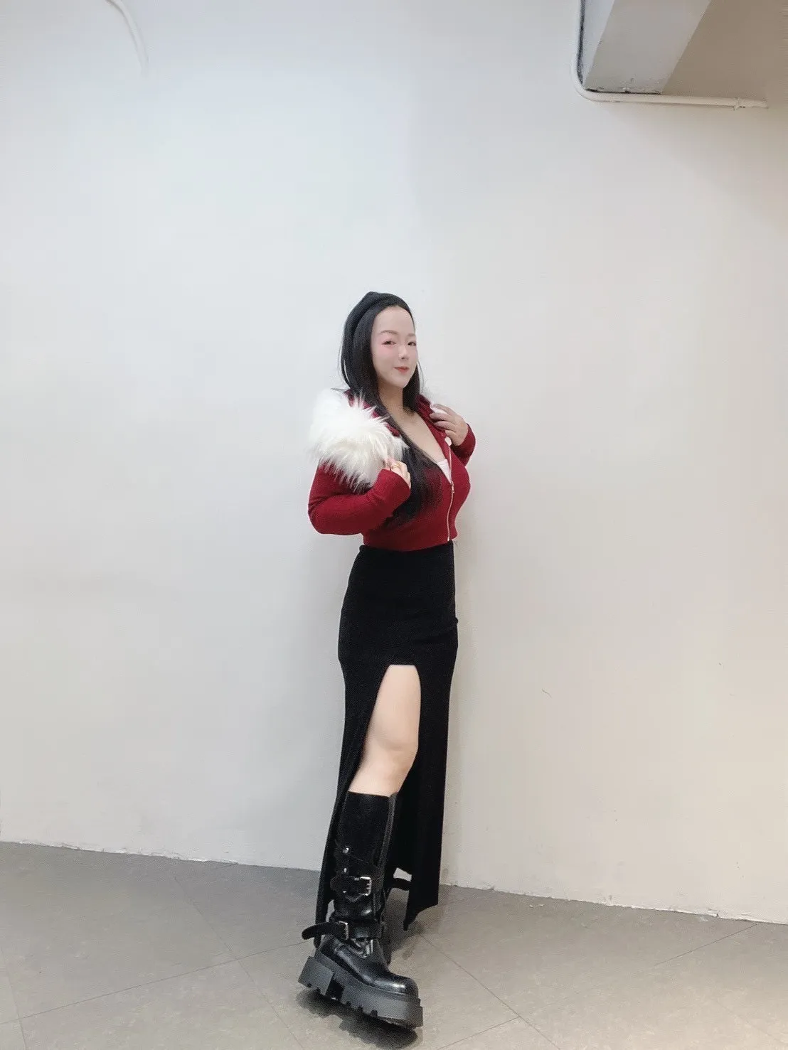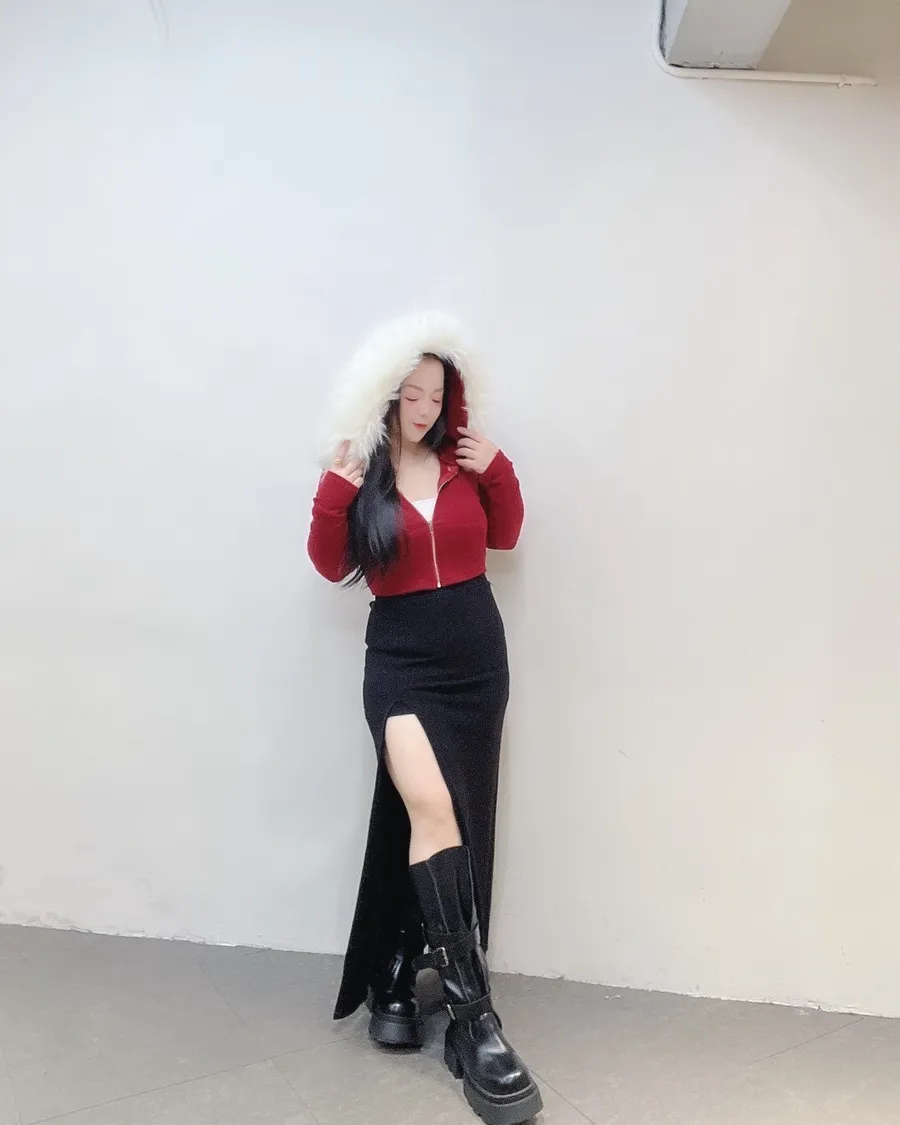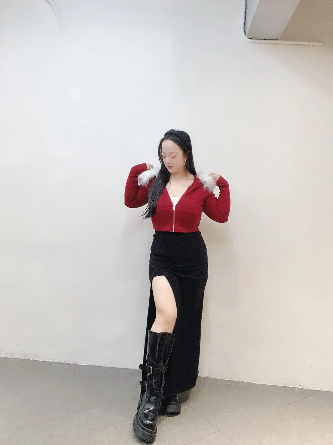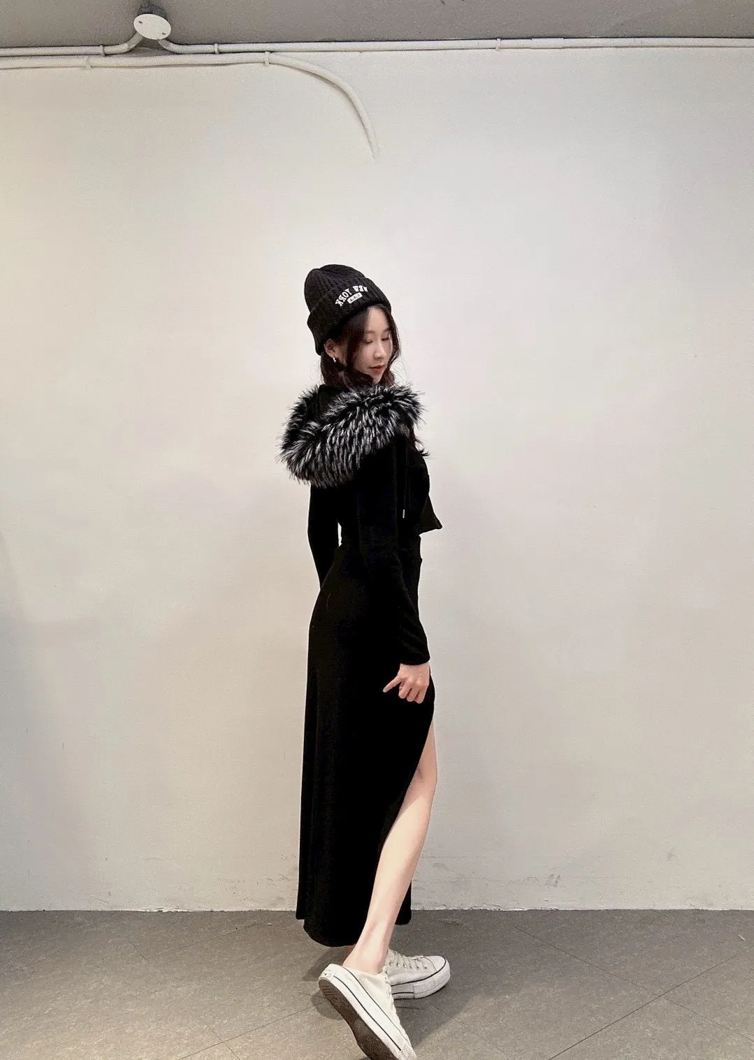 #02134 冬季大蓬蓬毛連帽套裝|短版坑條上衣+開岔長裙