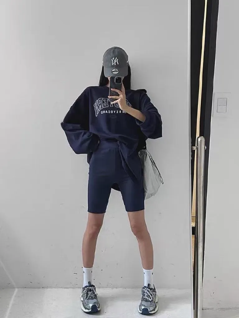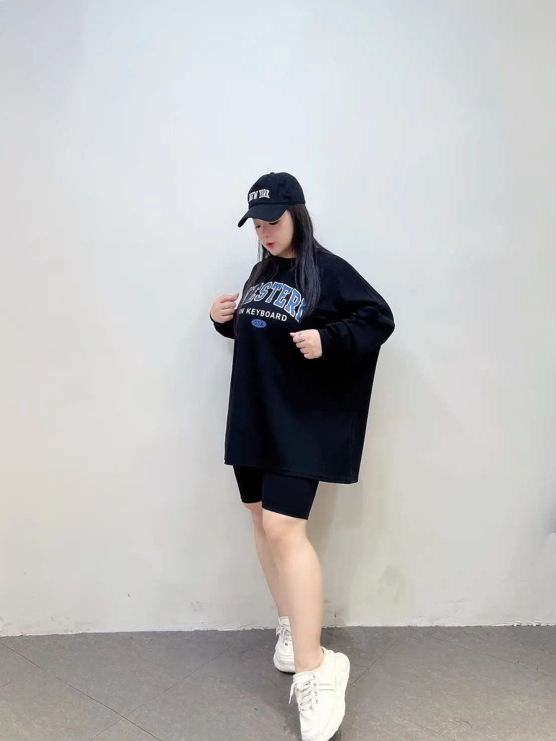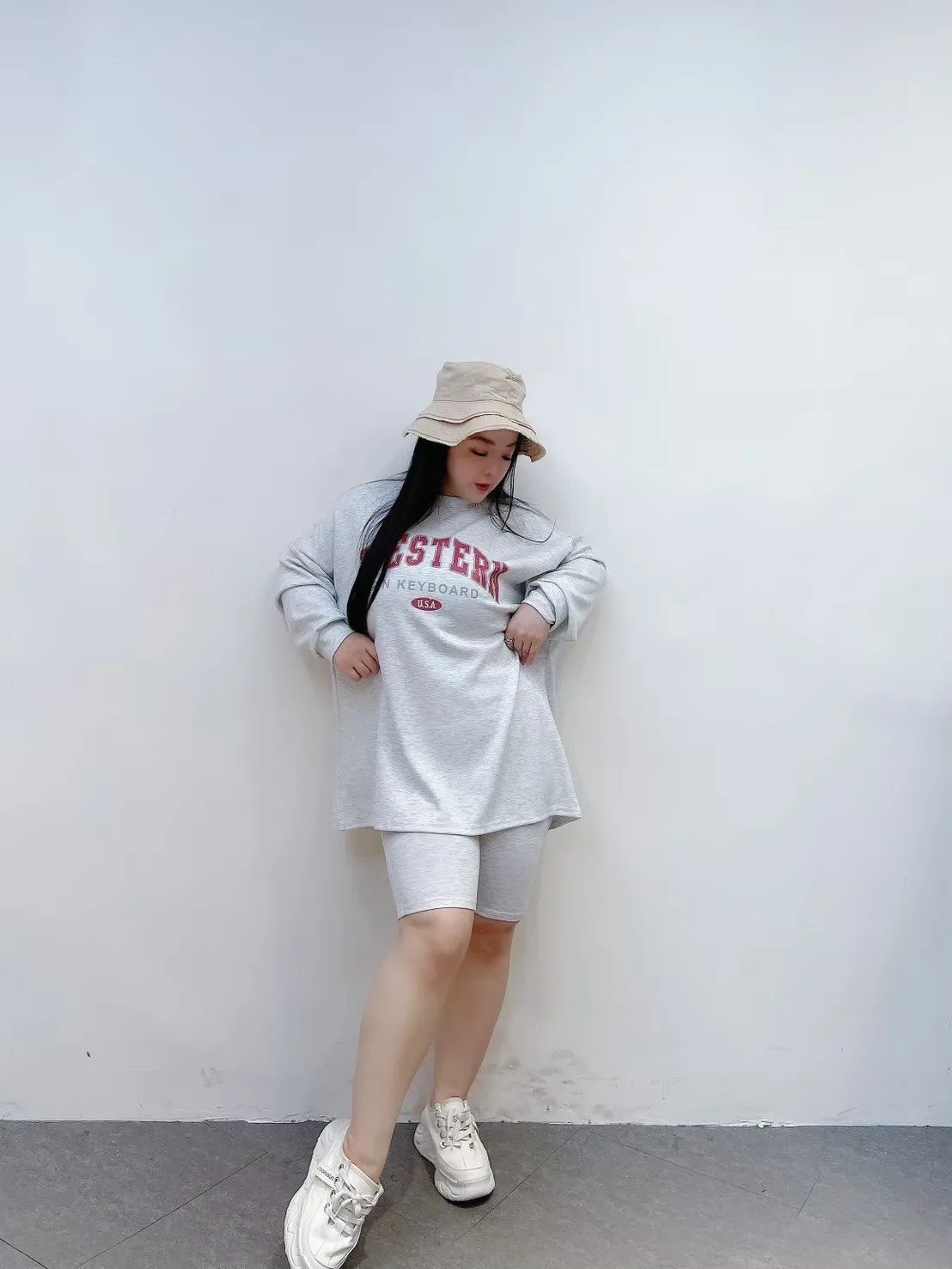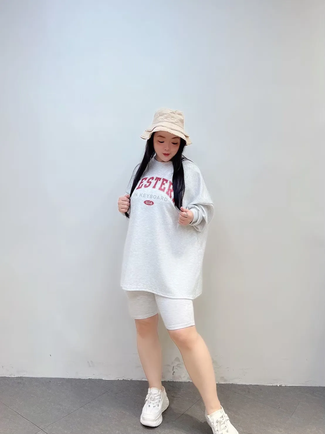 上衣寬鬆不貼身、五分褲長度剛好修飾大腿,