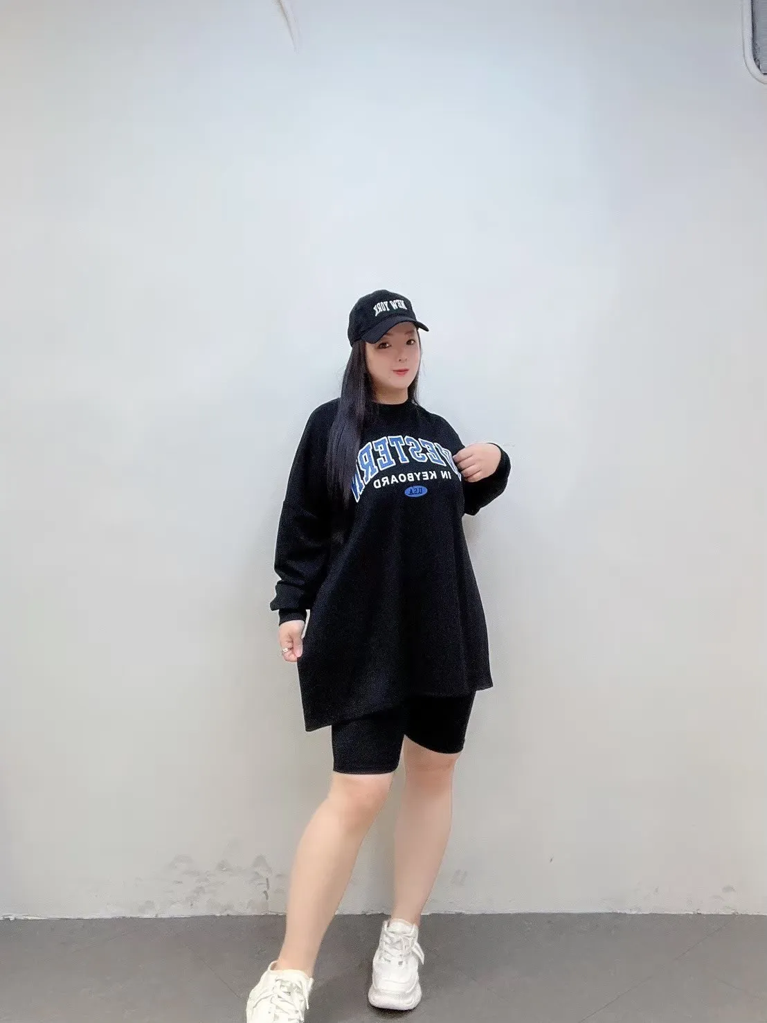 ✔ 上衣長版寬鬆,遮肚遮臀友善