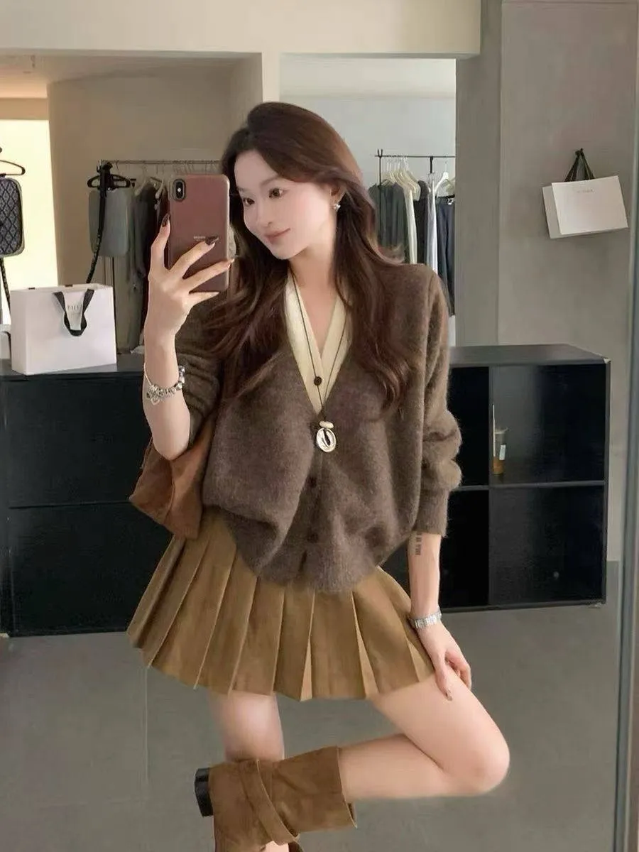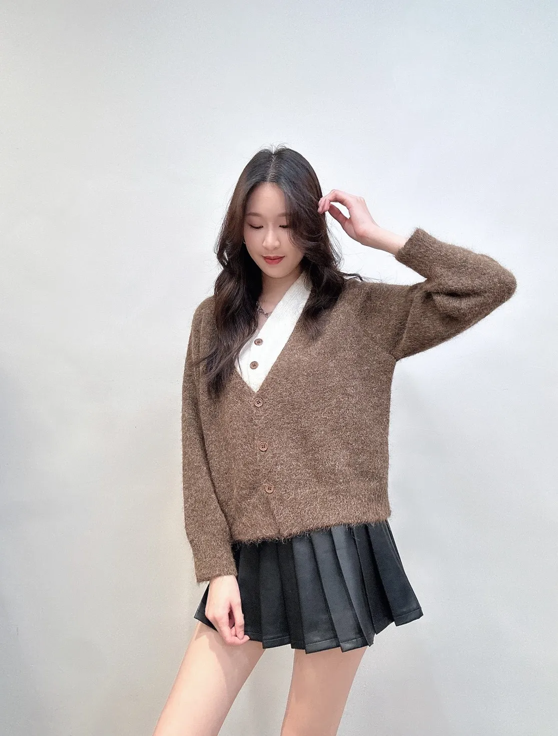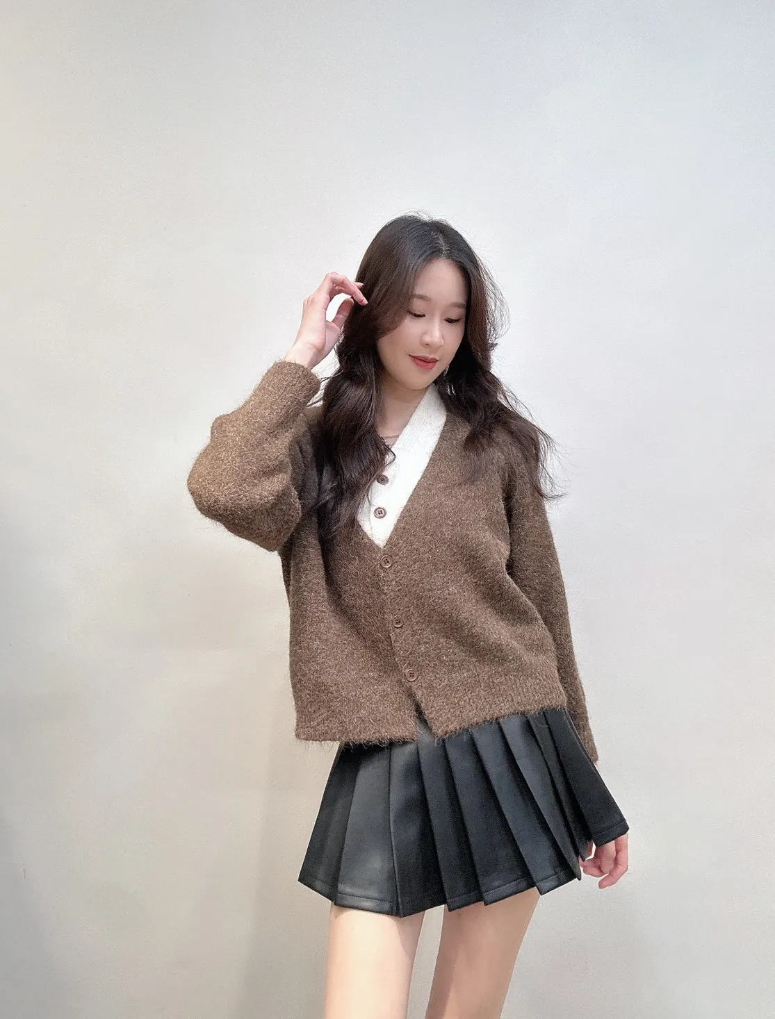 🧶 撞色柔絨 假兩件 V 領開襟針織外套