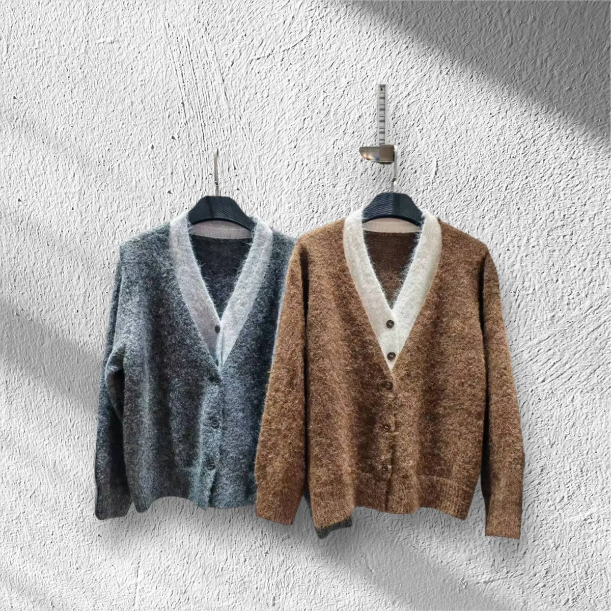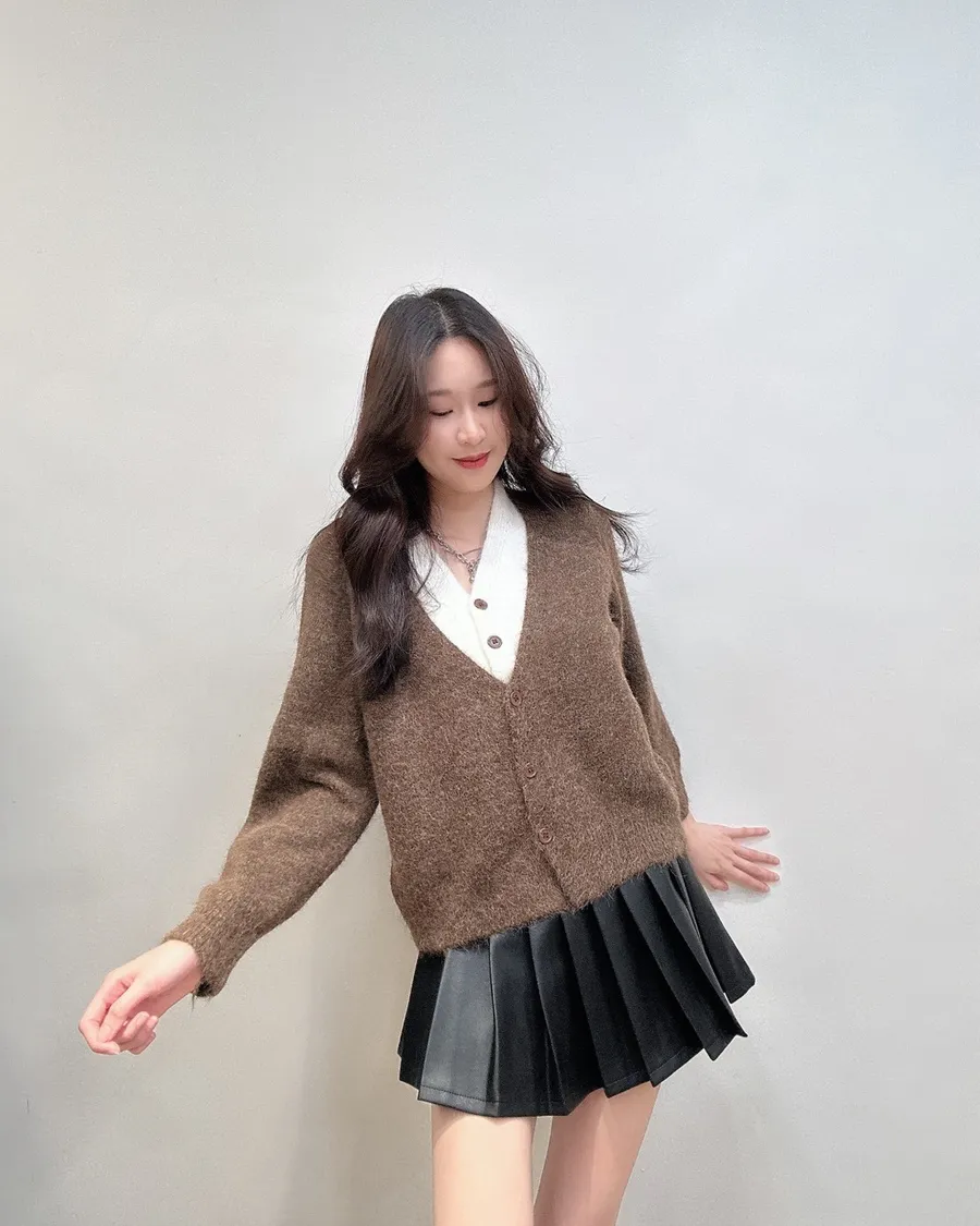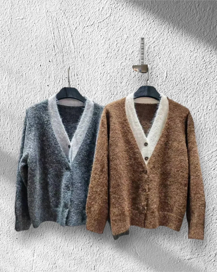🔆影片介紹在這裡➡🧶 撞色柔絨 假兩件 V 領開襟針織外套