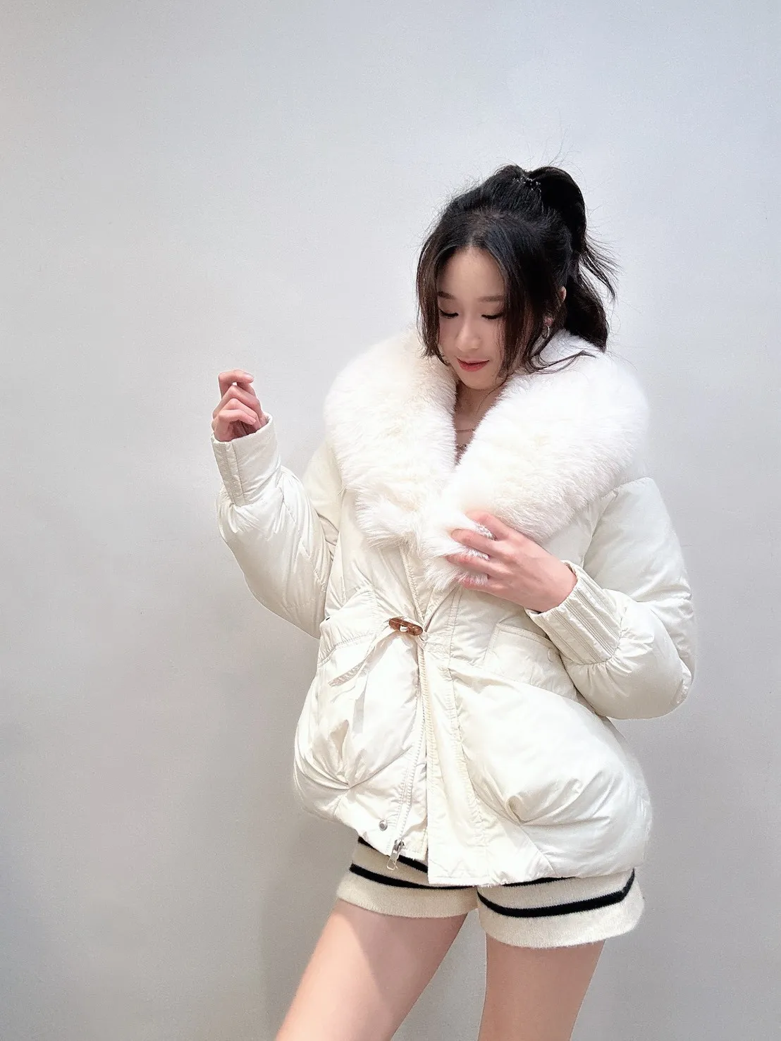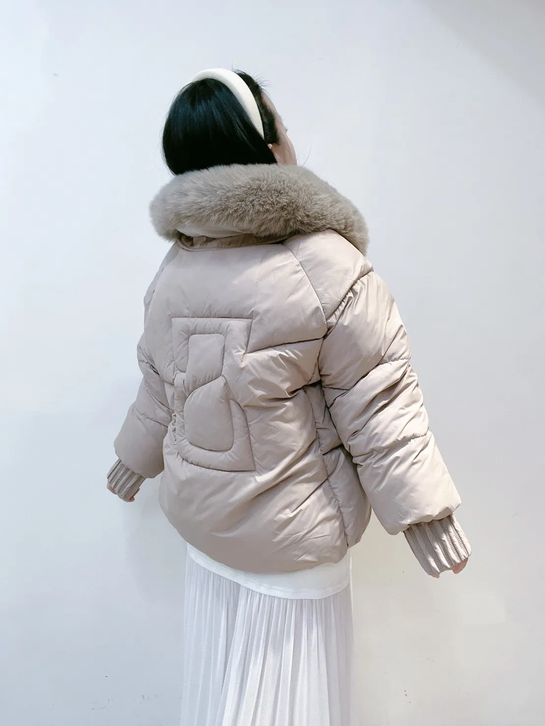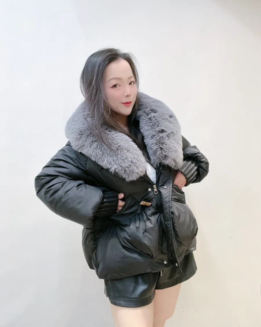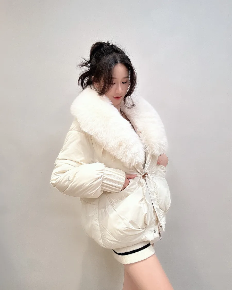羽絨外套的輪廓乾淨俐落,搭配澎潤細緻的狐絨領,