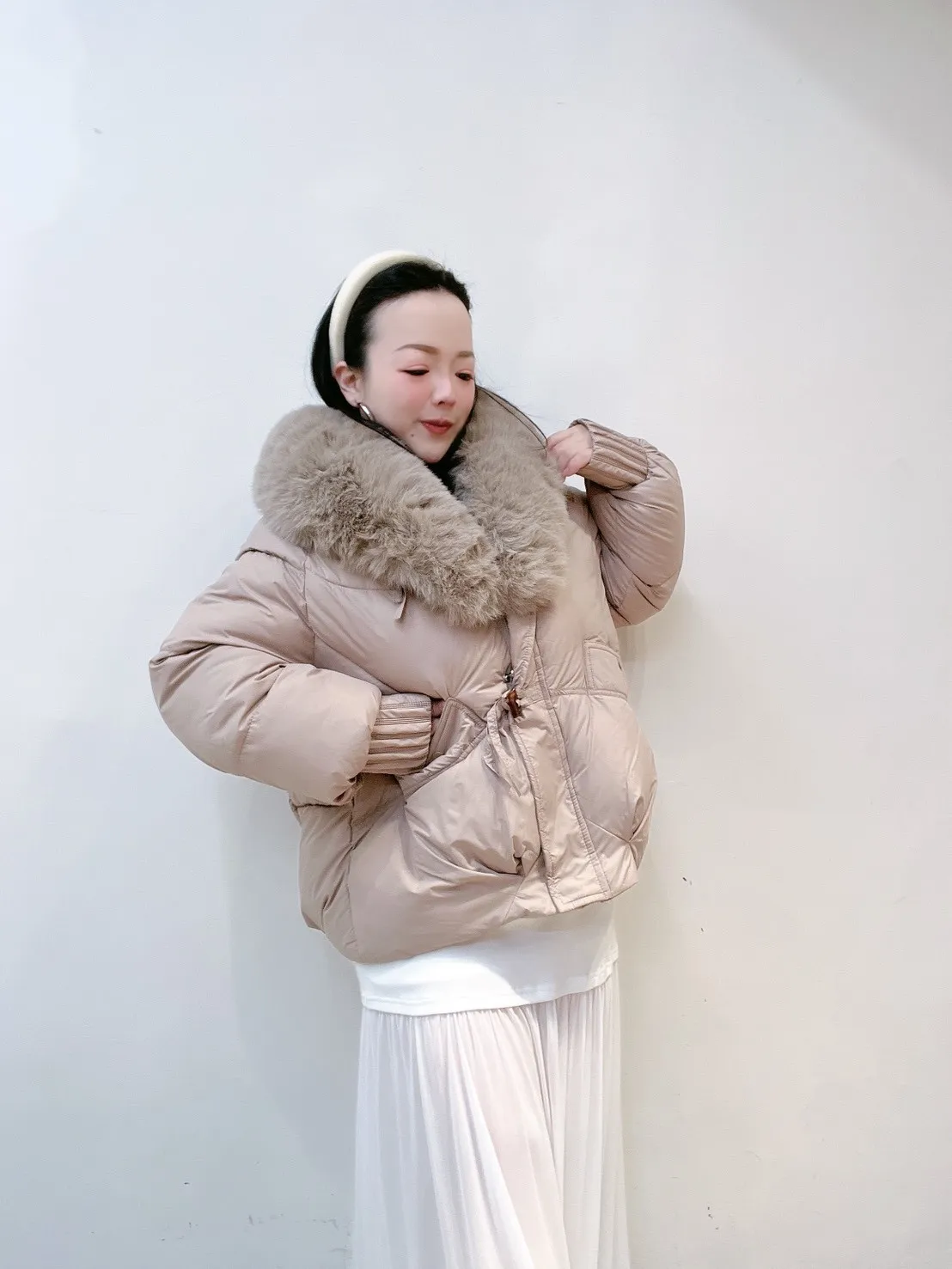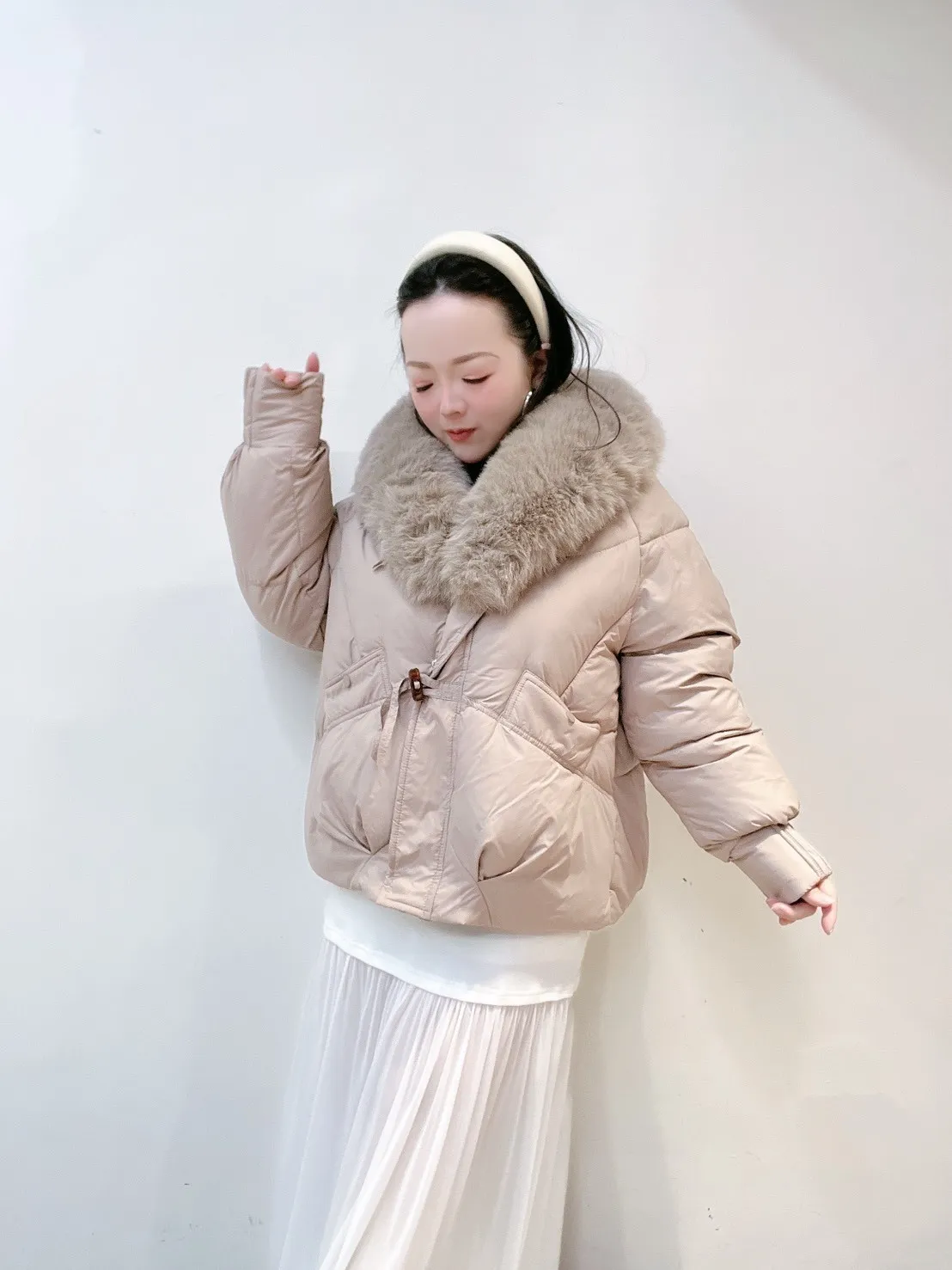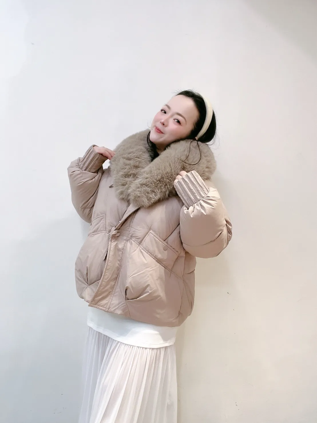 羽絨外套的輪廓乾淨俐落,搭配澎潤細緻的狐絨領,