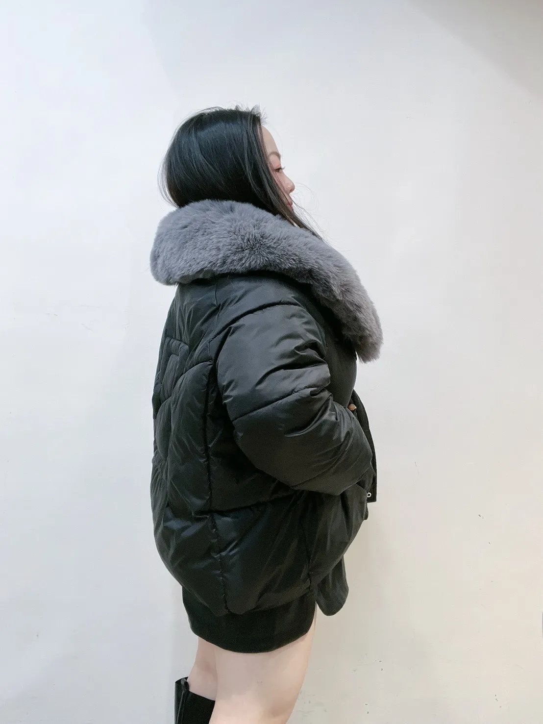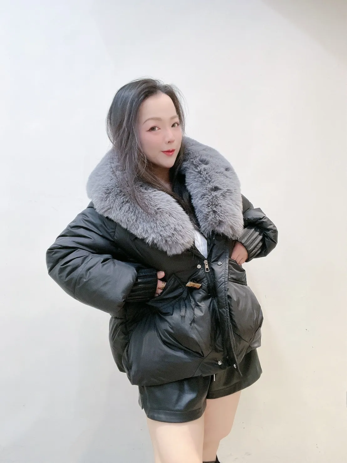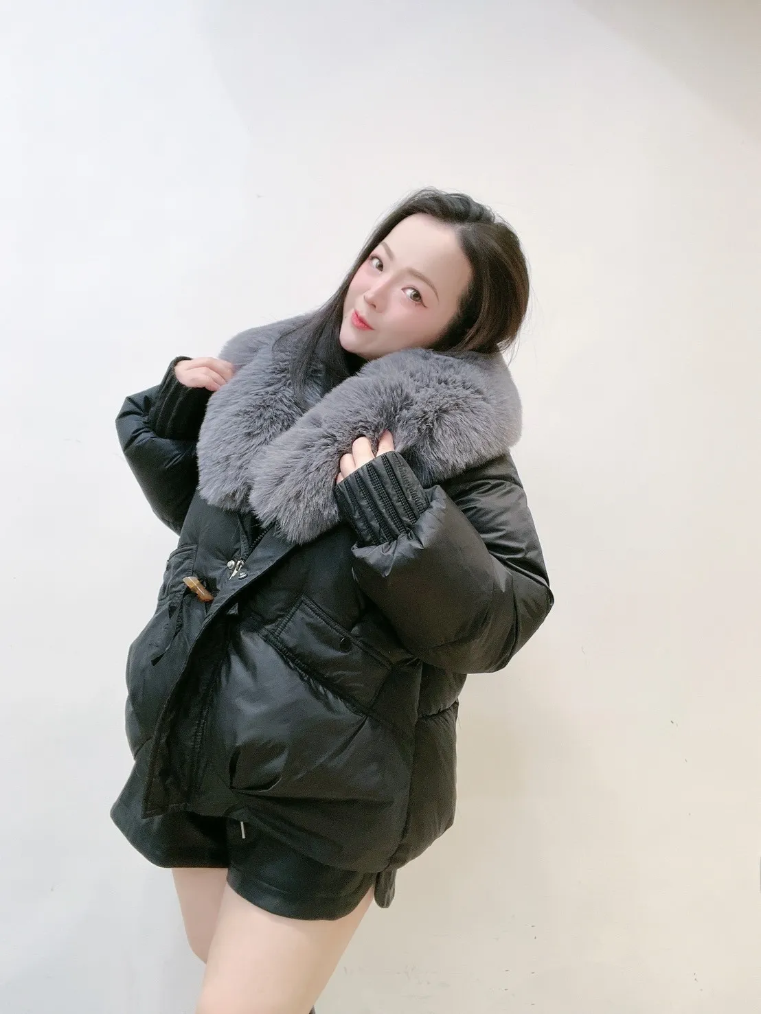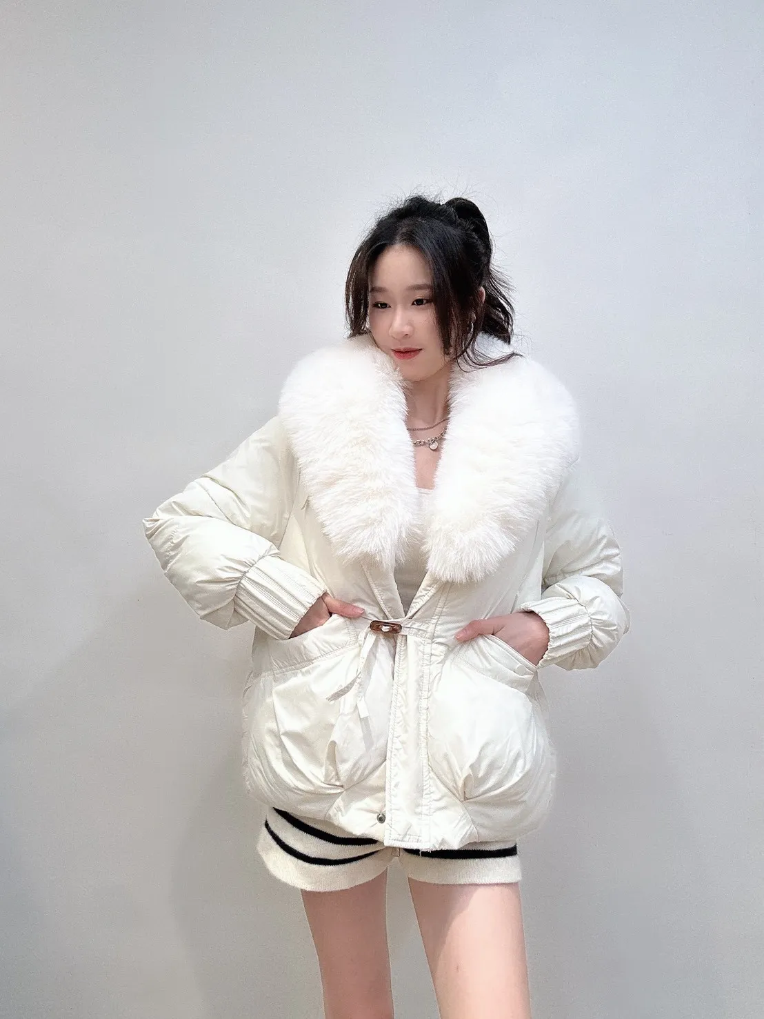 羽絨外套的輪廓乾淨俐落,搭配澎潤細緻的狐絨領,