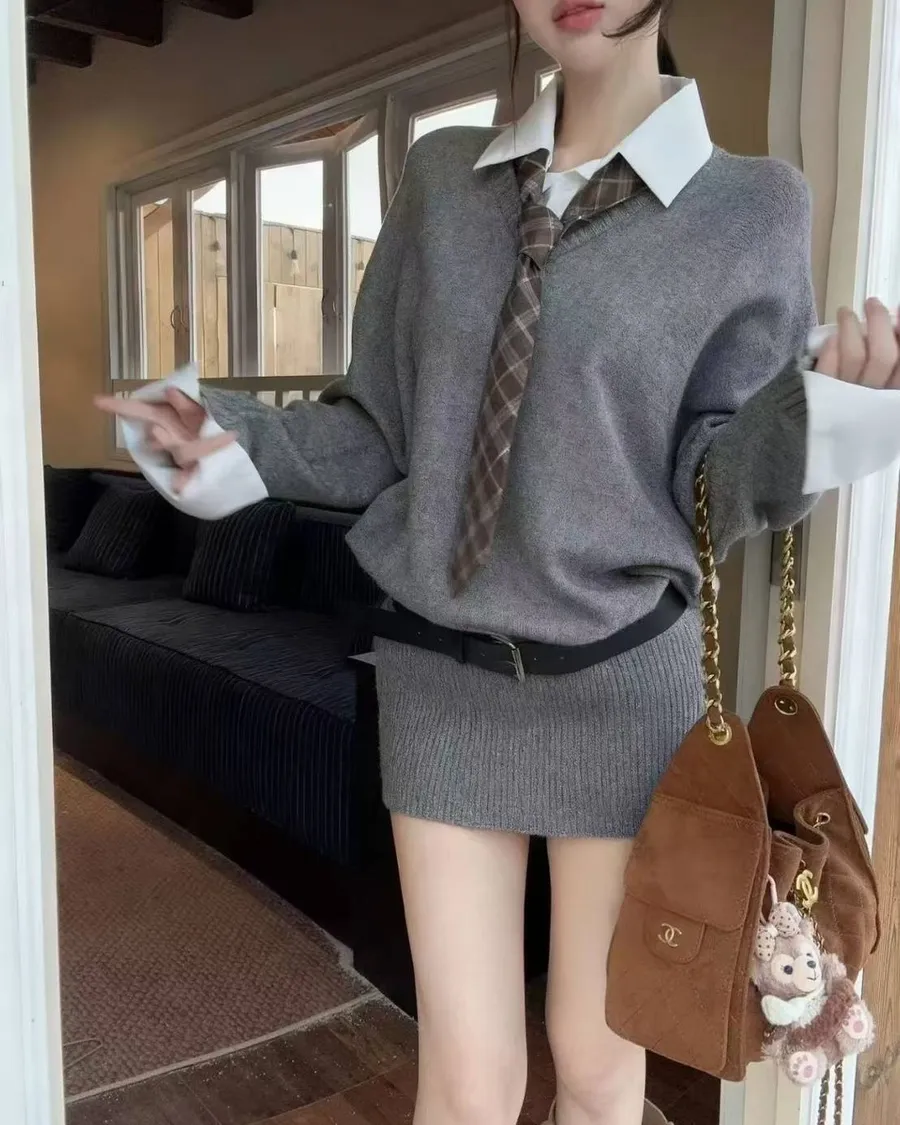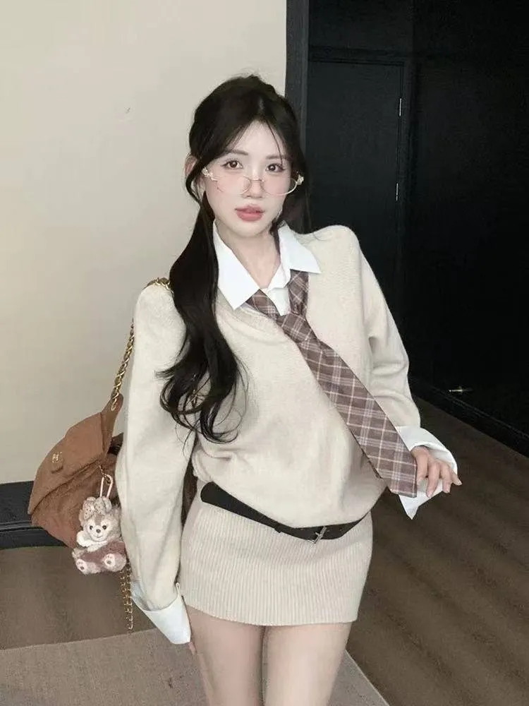 🎓 學院風假兩件領帶毛衣