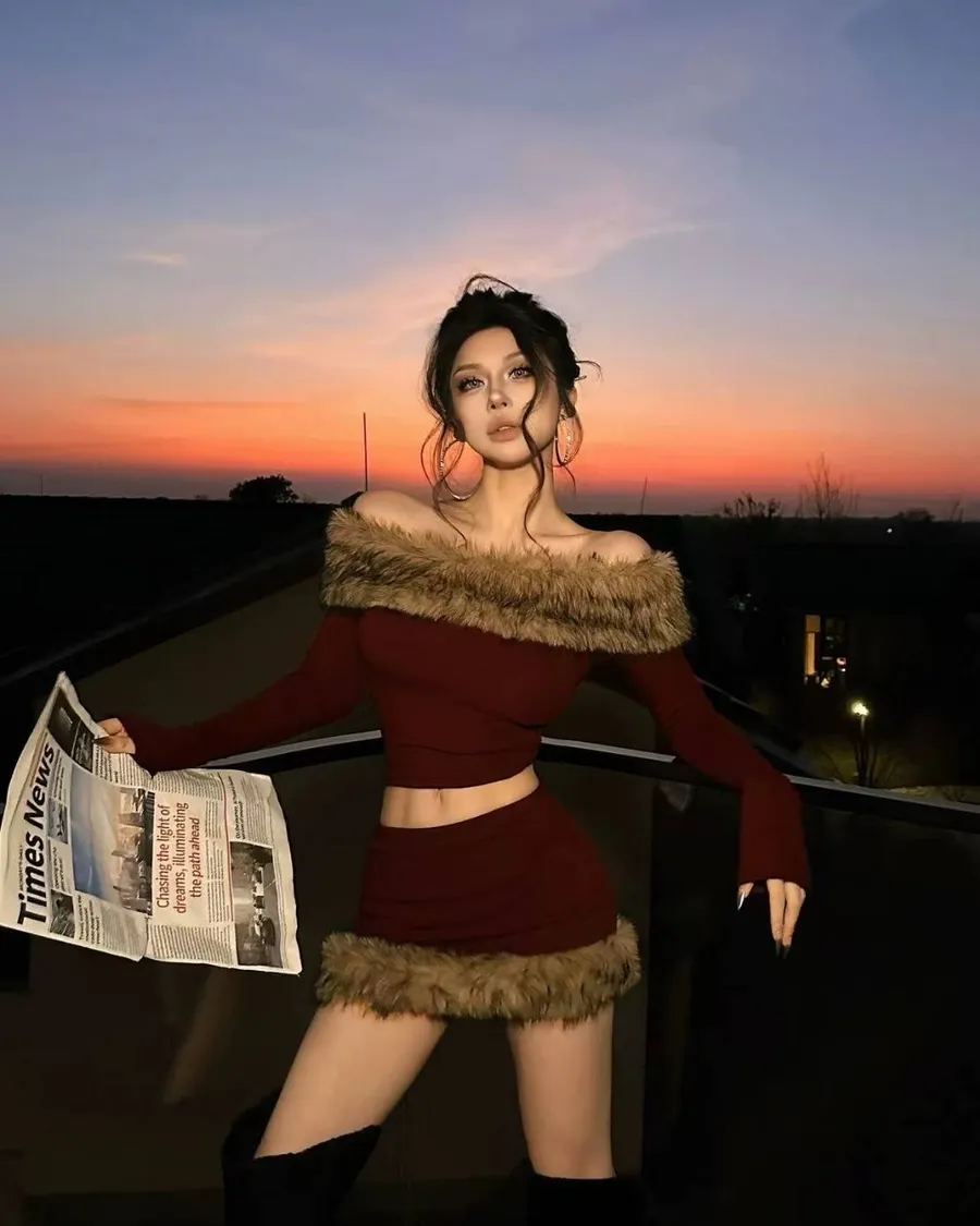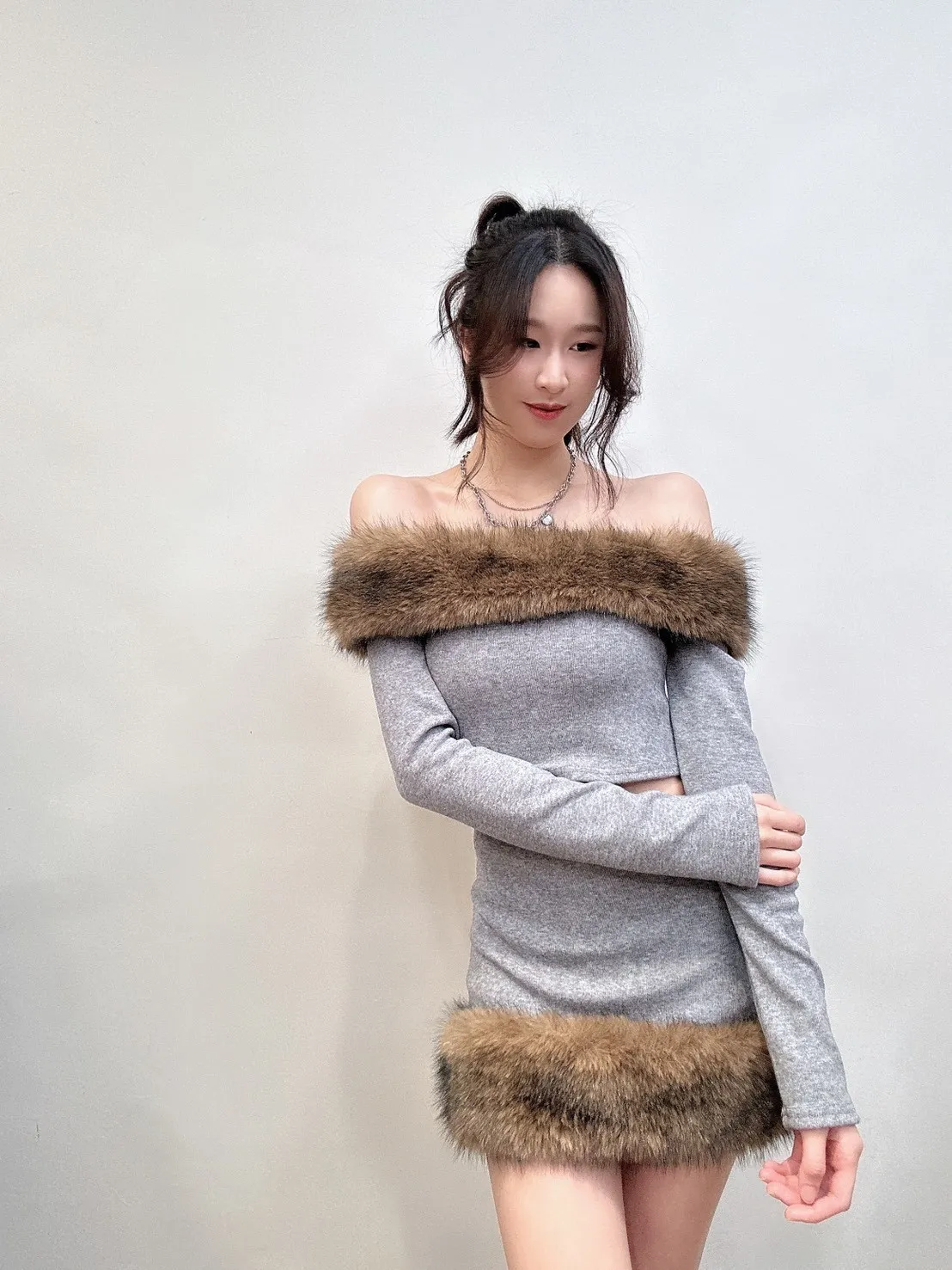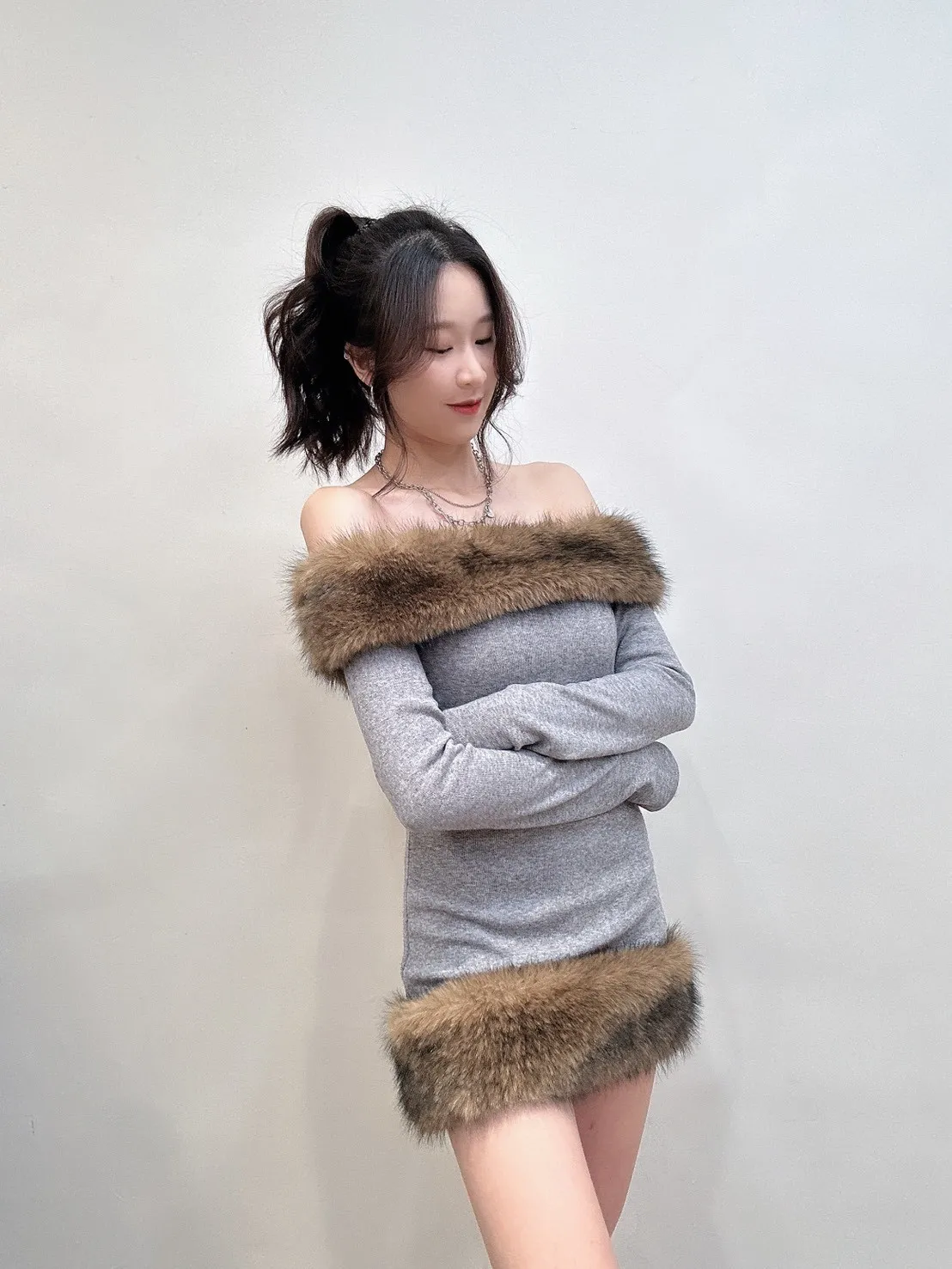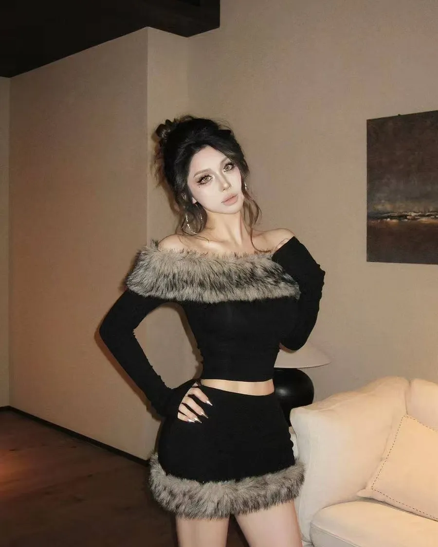 一字領+毛毛邊,鎖骨、肩線、腿線一次到位。
