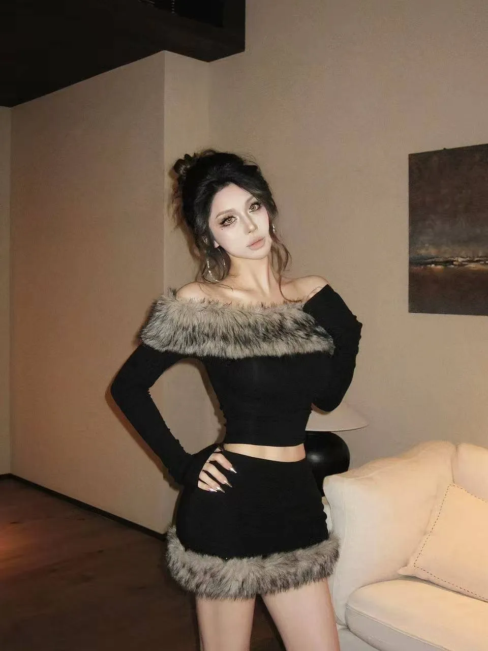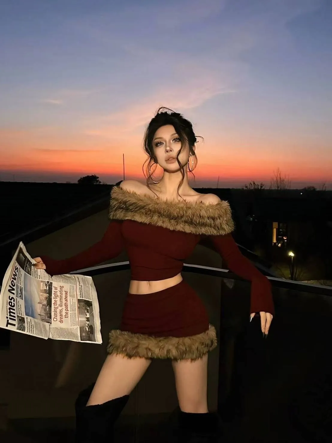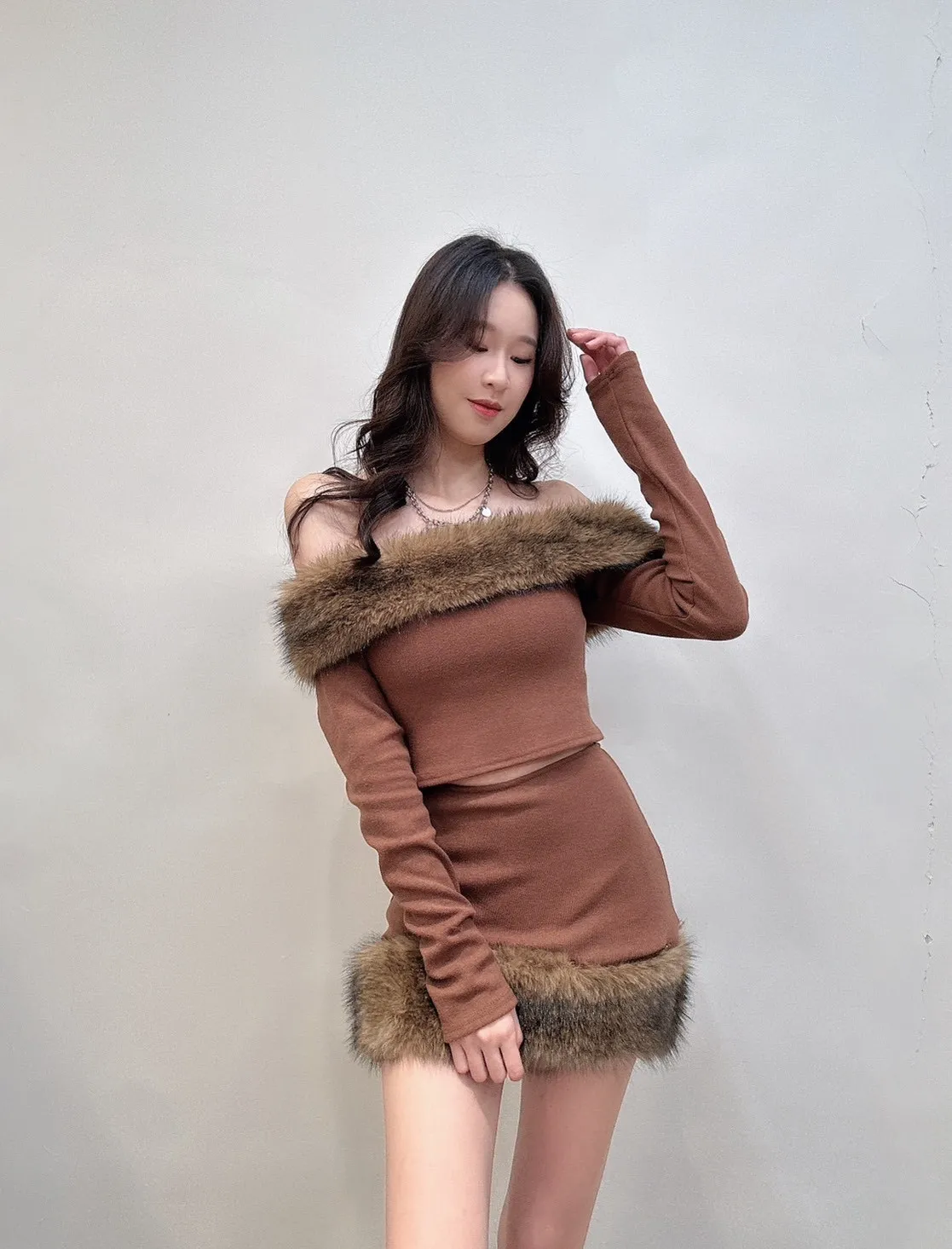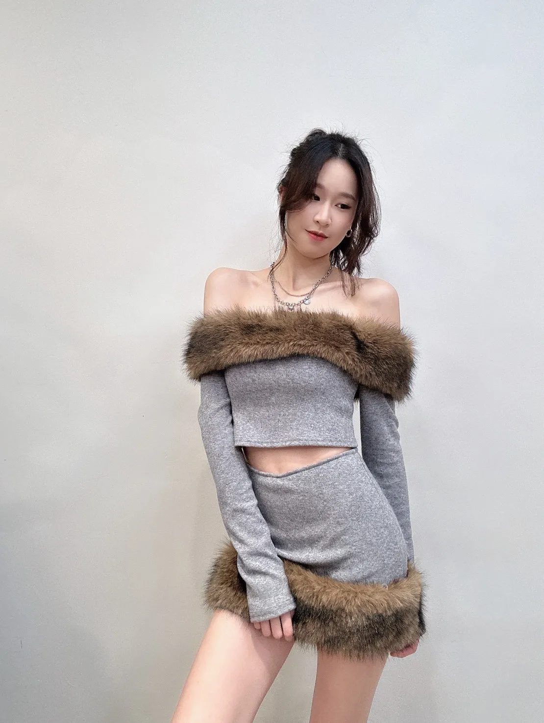 一字領+毛毛邊,鎖骨、肩線、腿線一次到位。