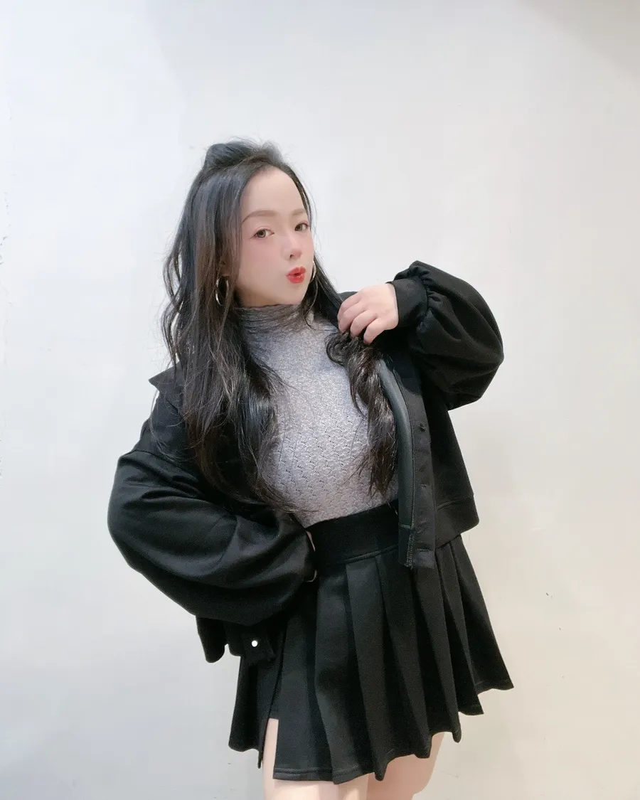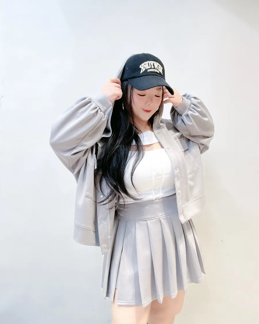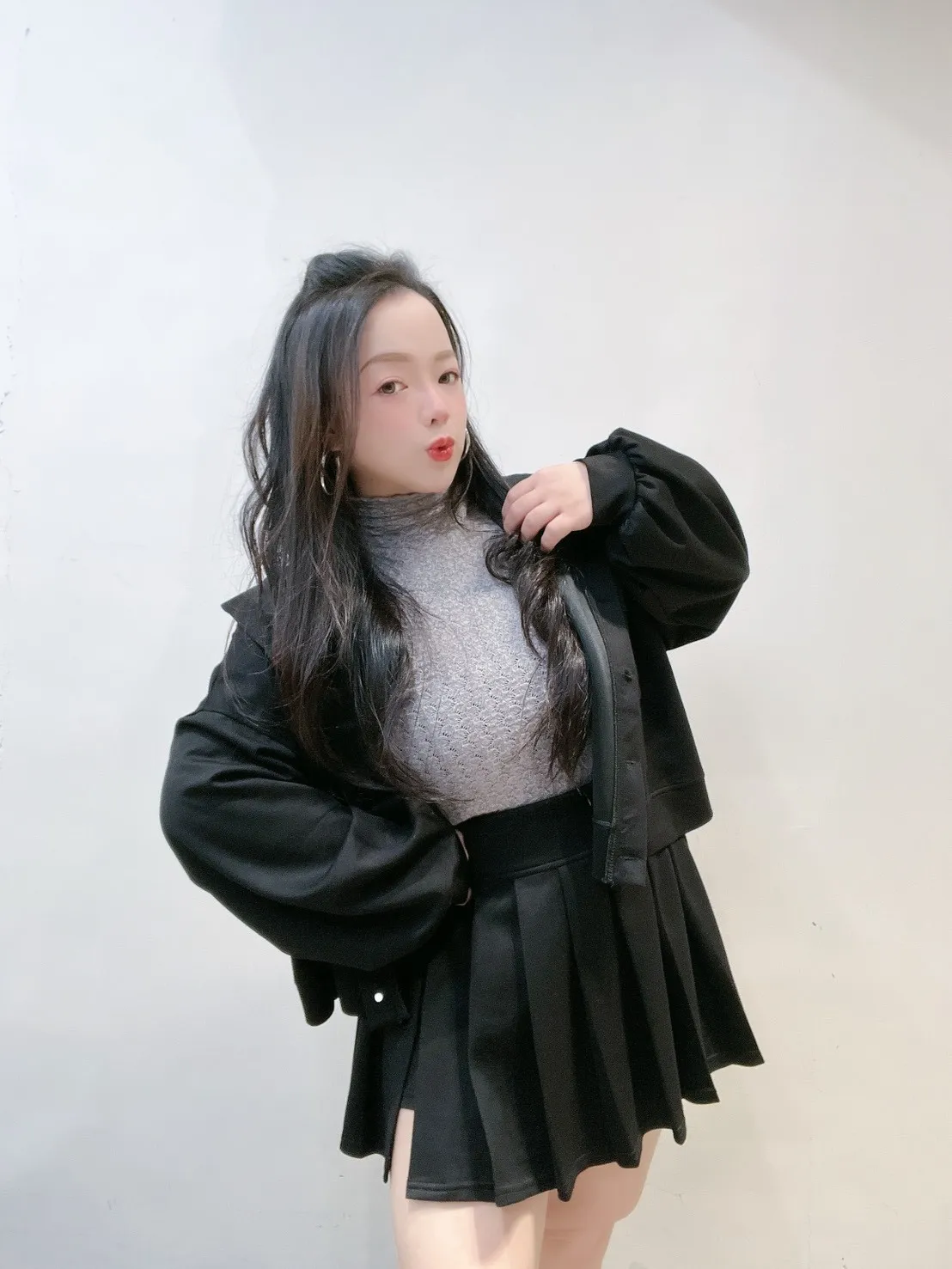 上身是甜辣連帽短外套,燈籠袖設計修飾手臂線條💪