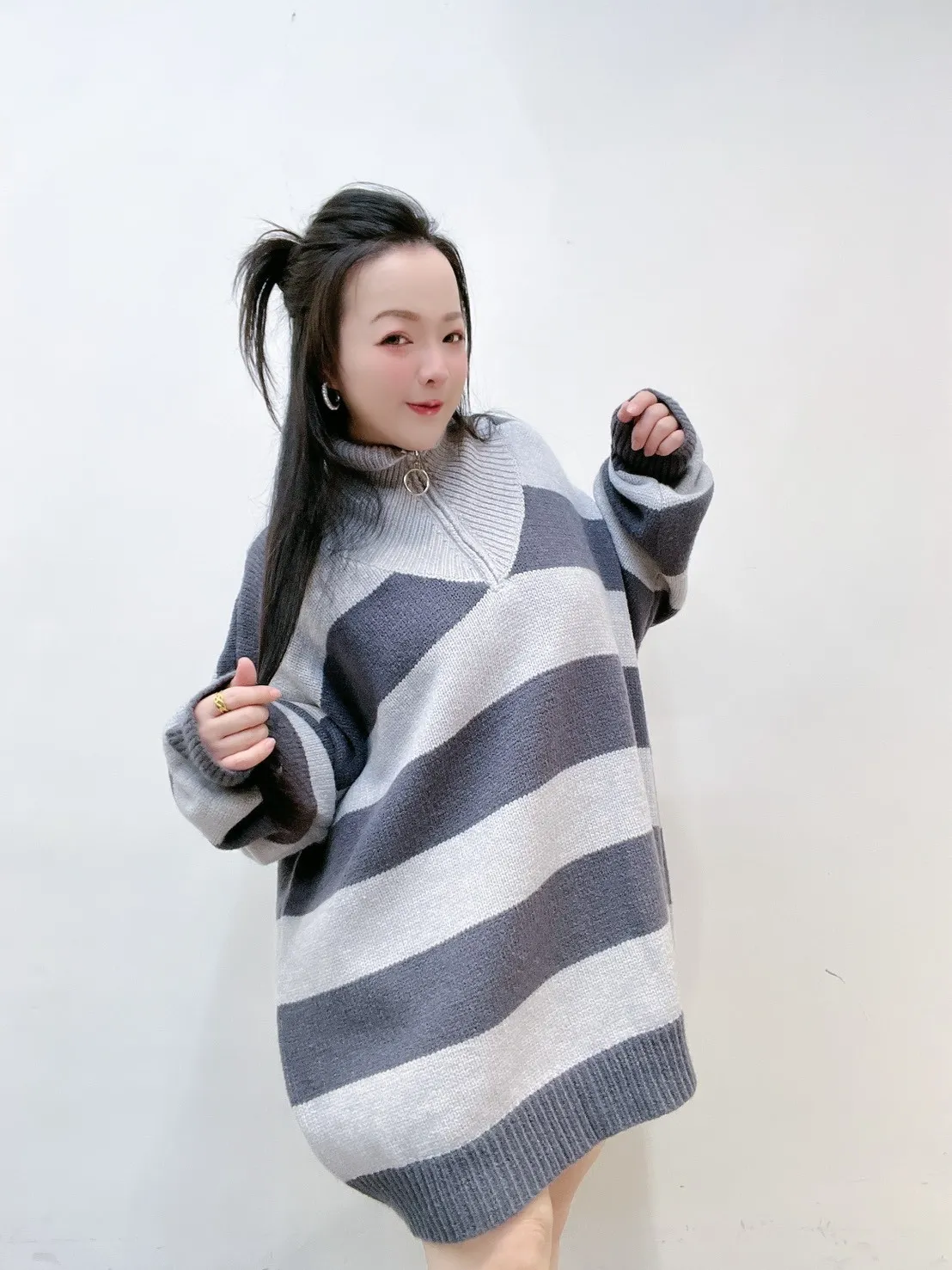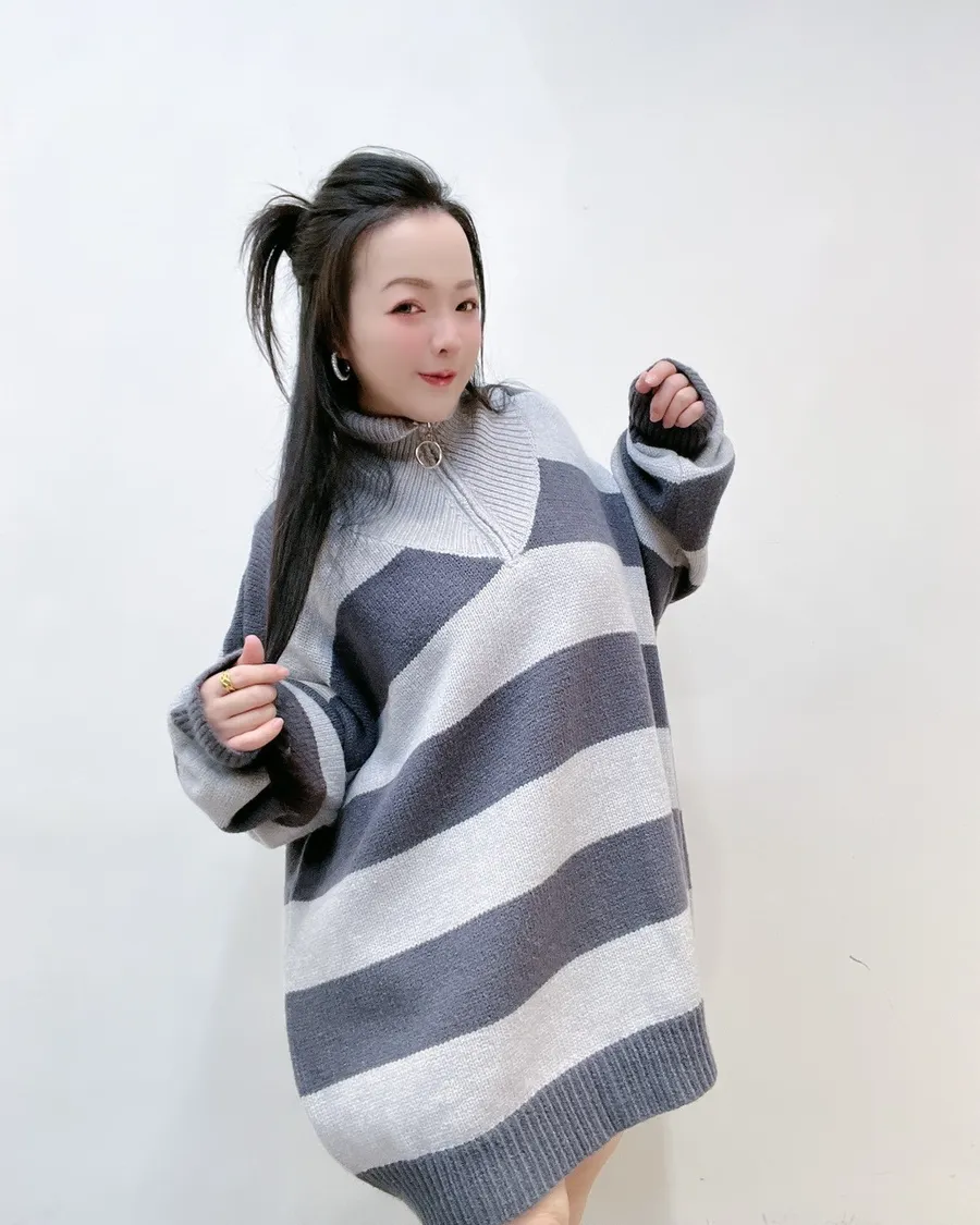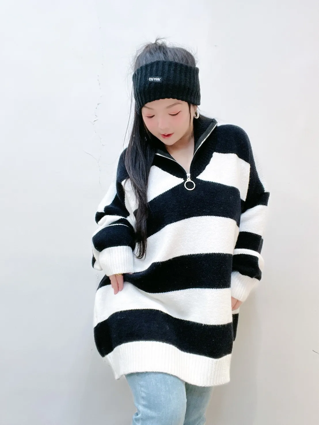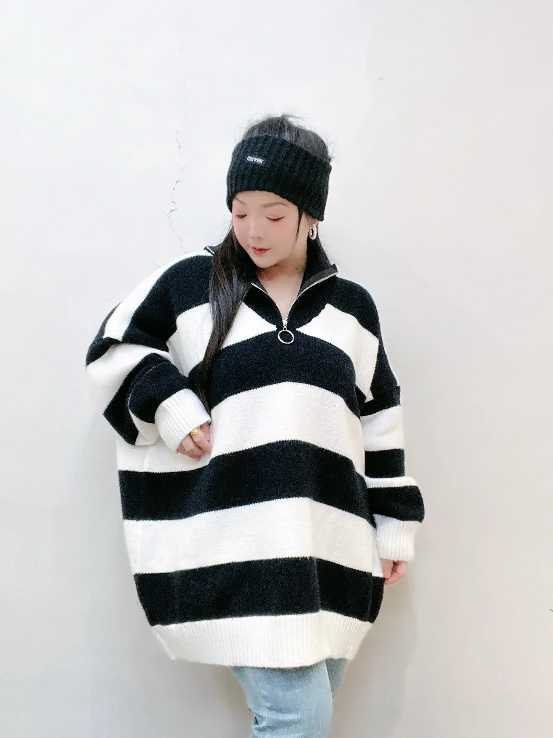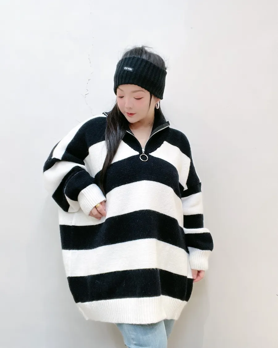 影片在這裡~寬條紋半拉鍊針織長版上衣