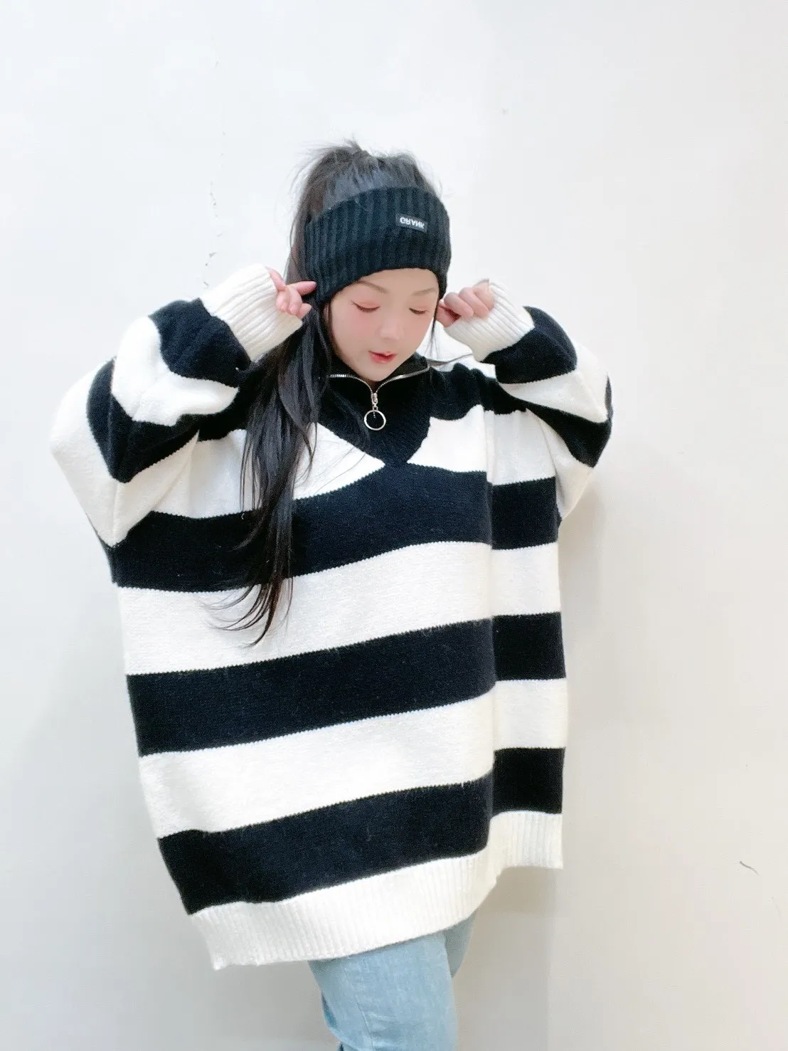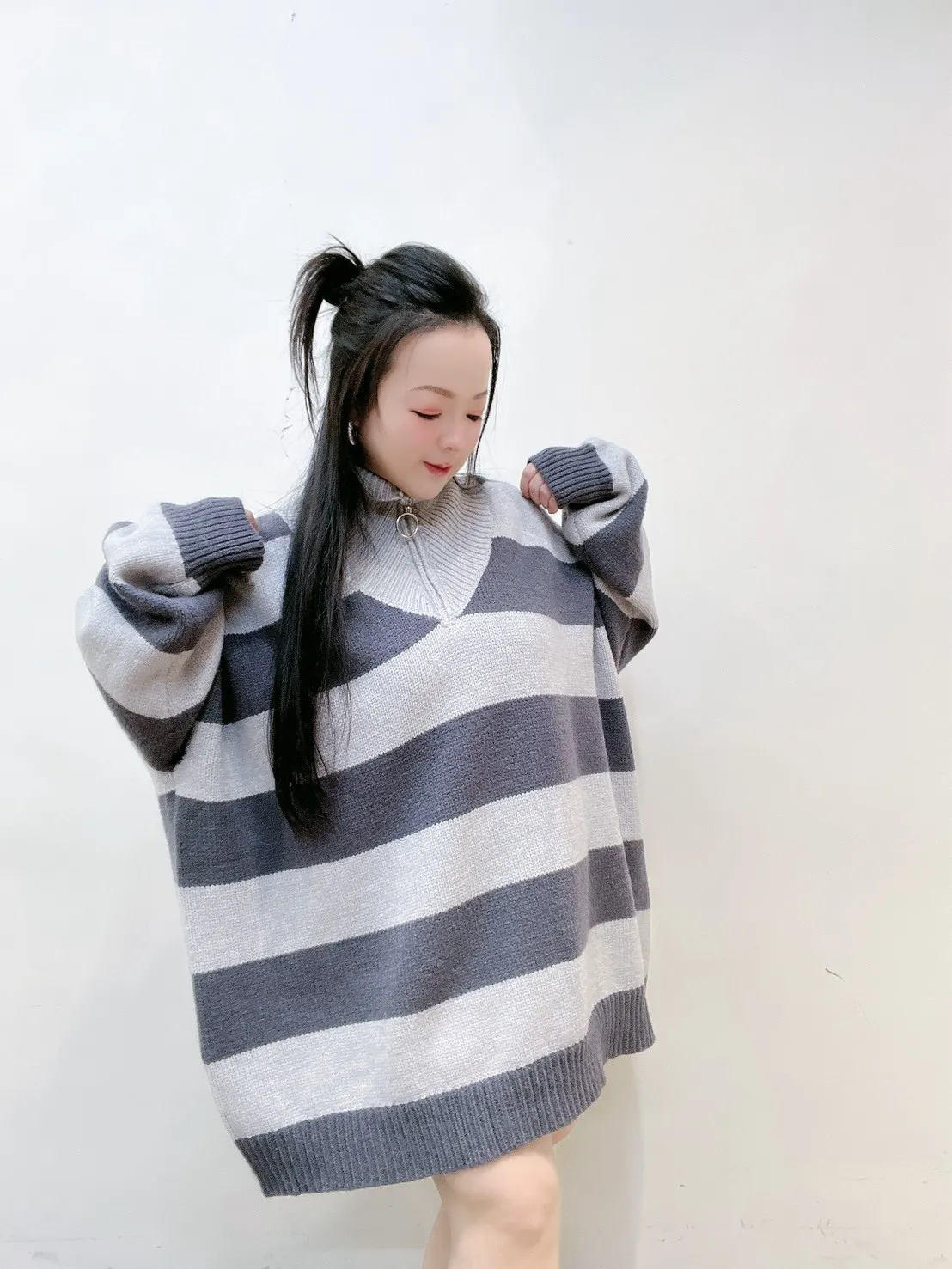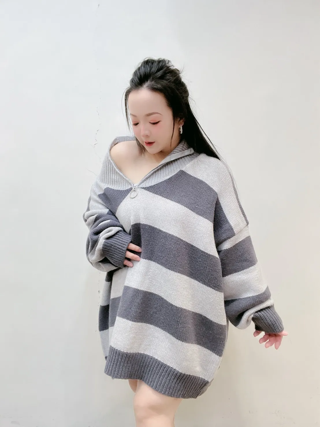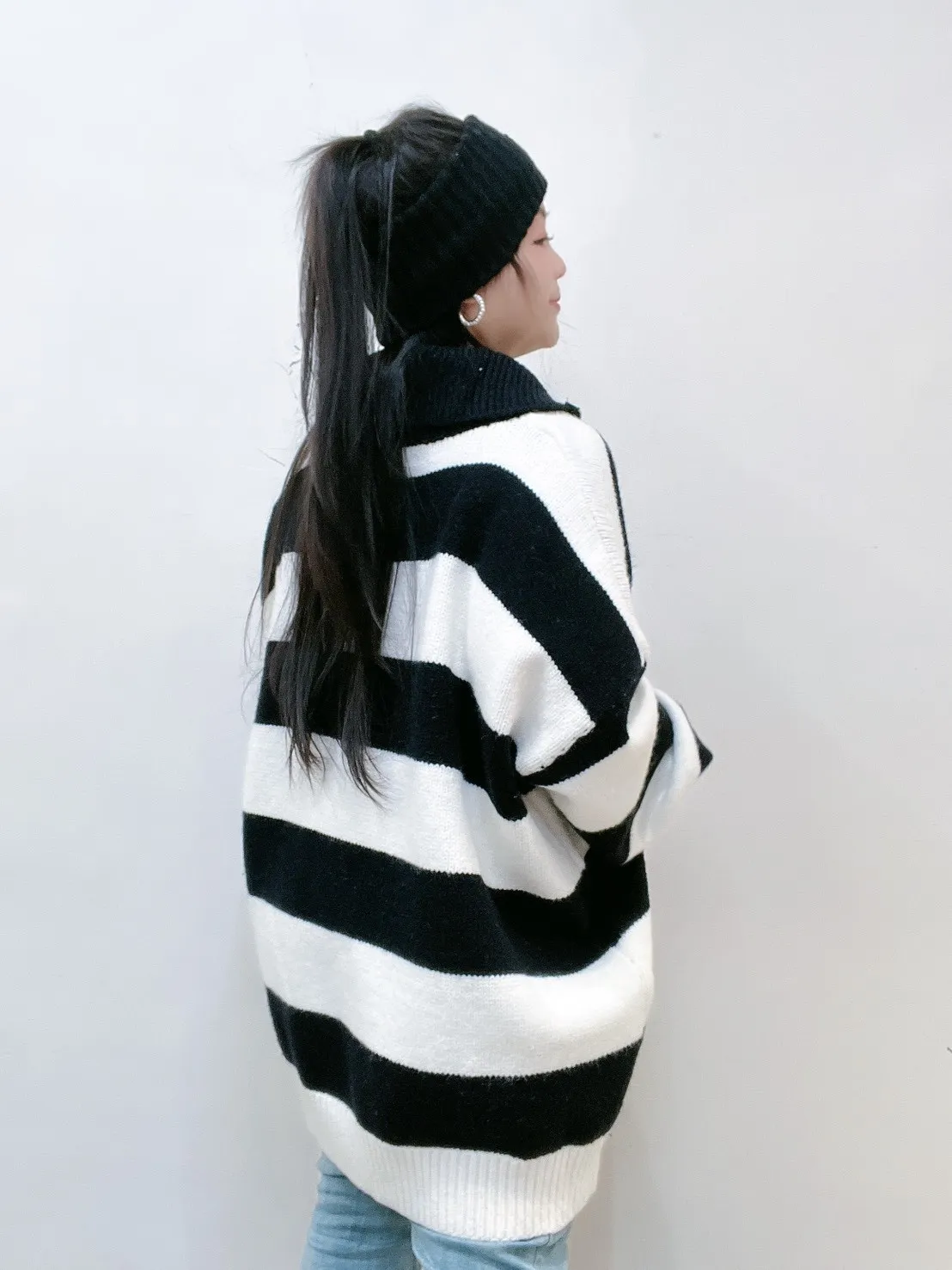 影片在這裡~寬條紋半拉鍊針織長版上衣