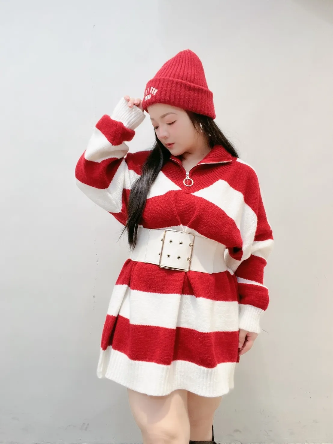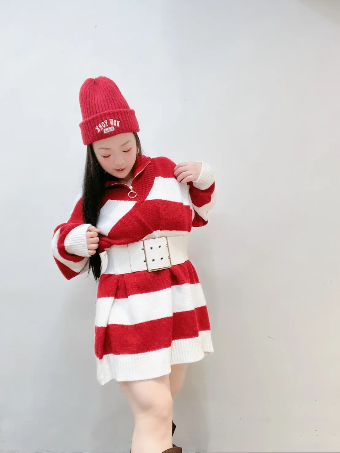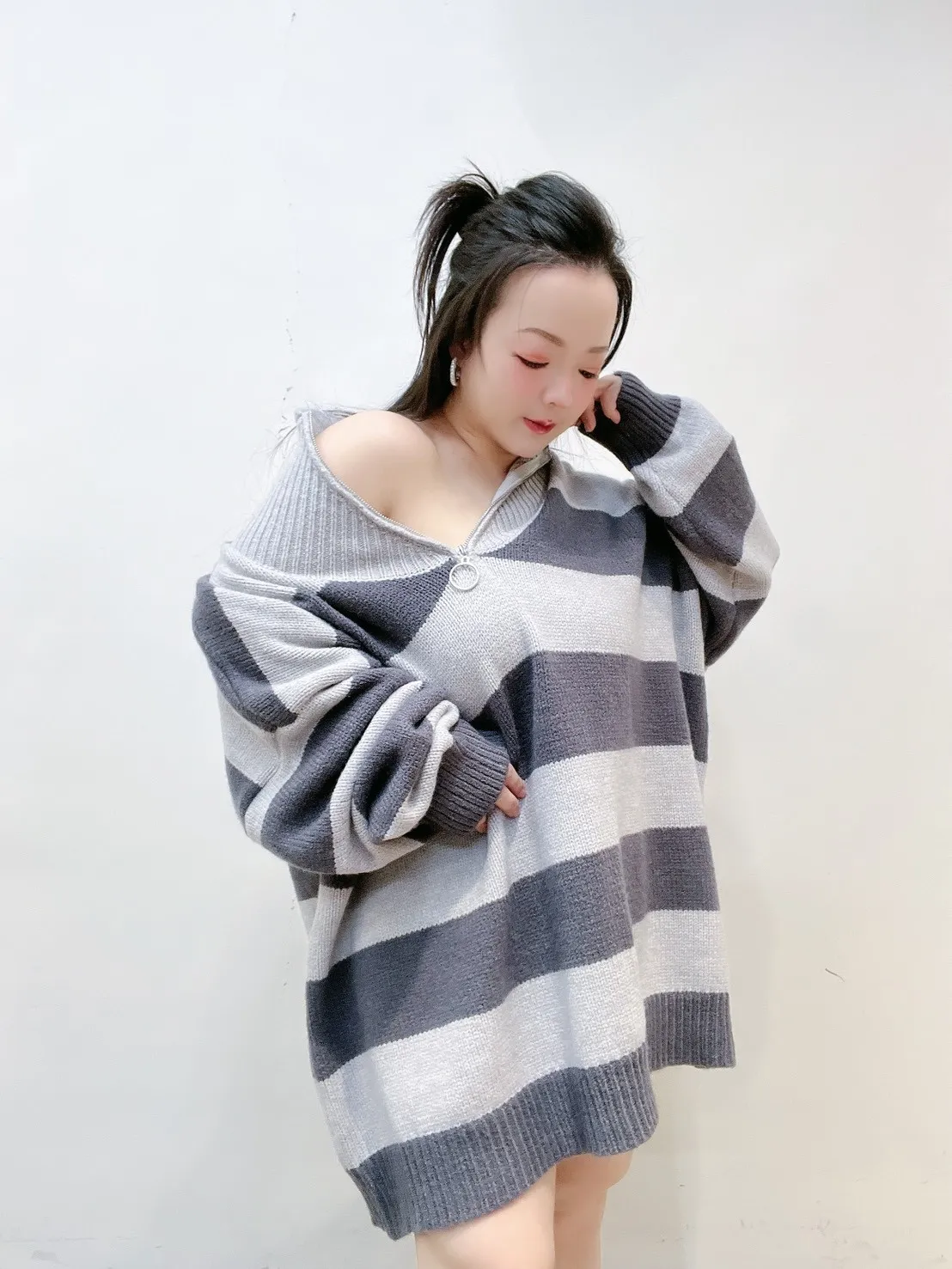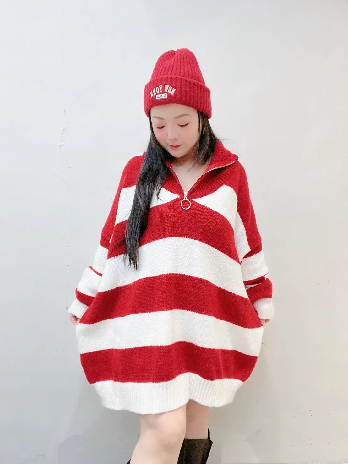 影片在這裡~寬條紋半拉鍊針織長版上衣