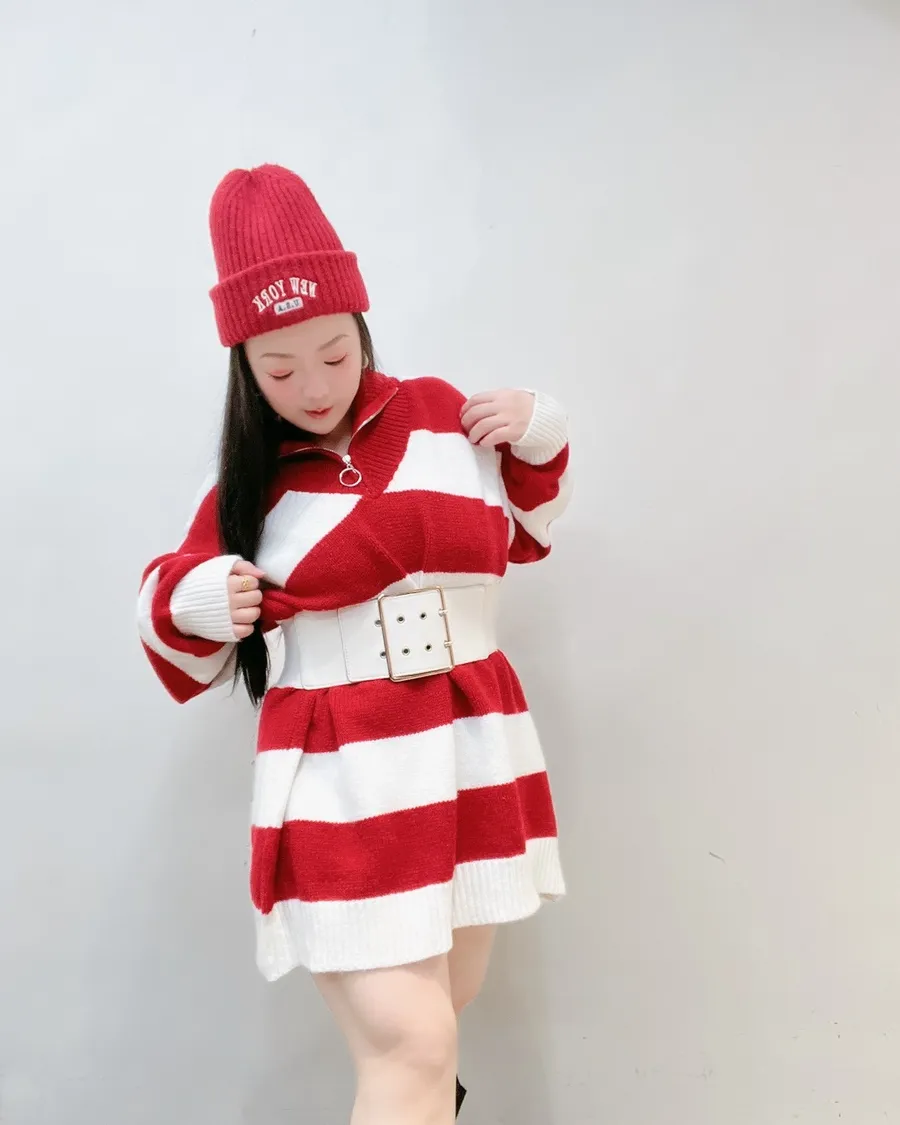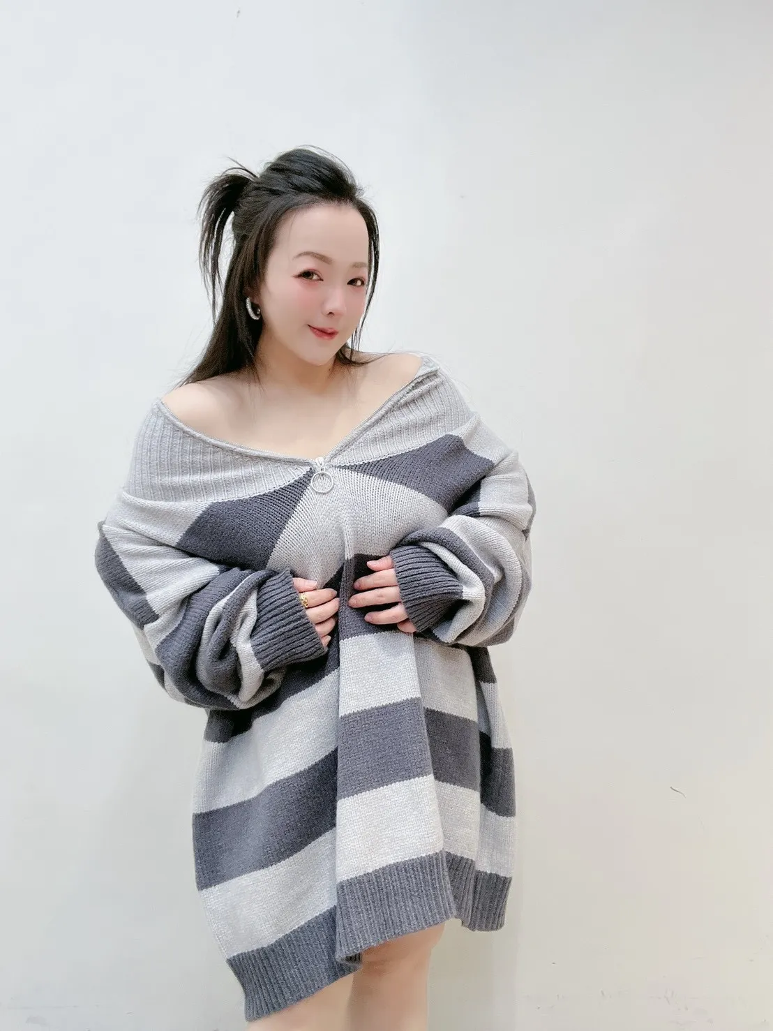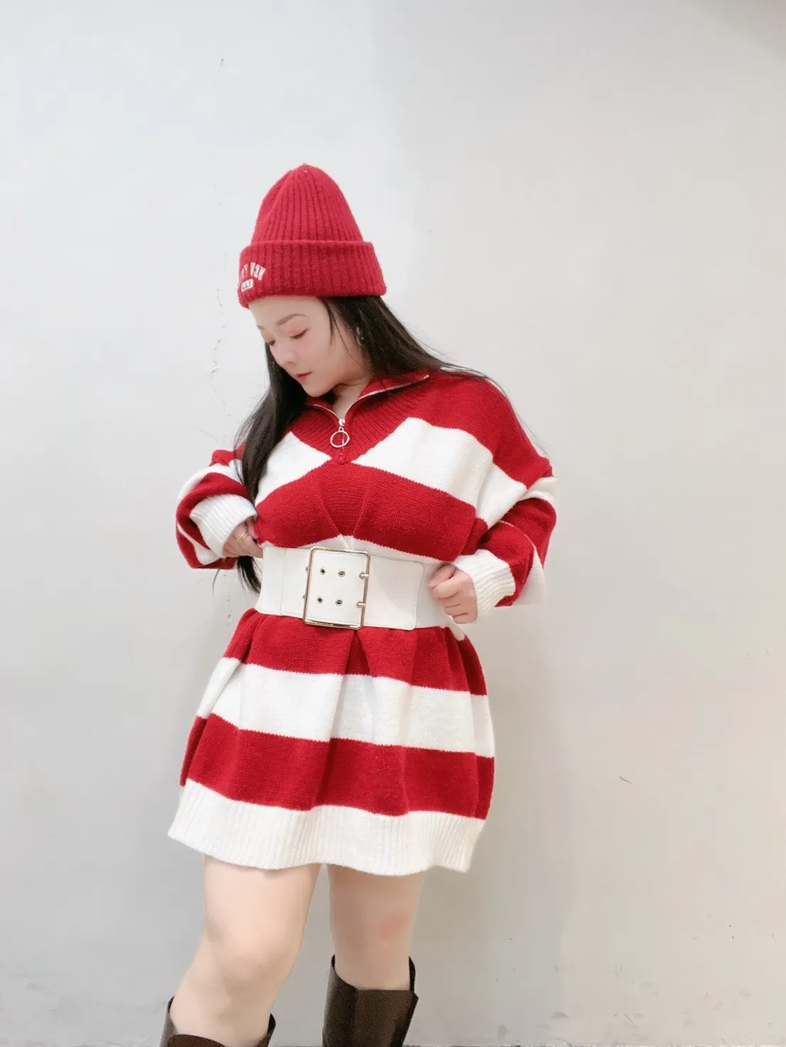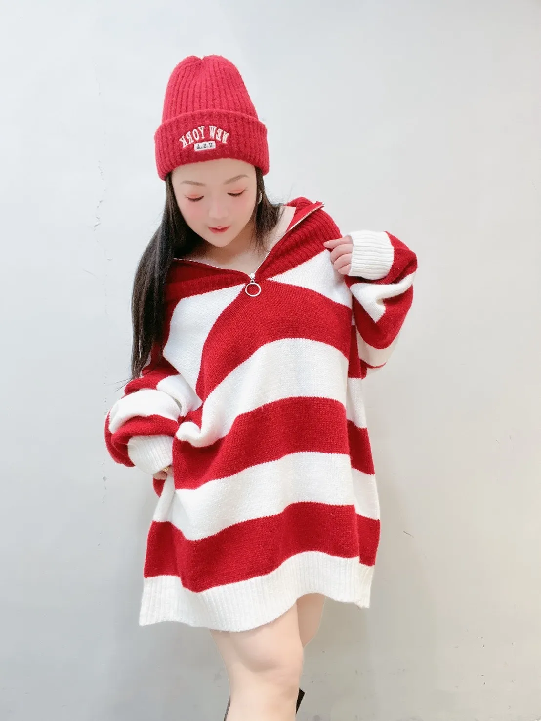 影片在這裡~寬條紋半拉鍊針織長版上衣
