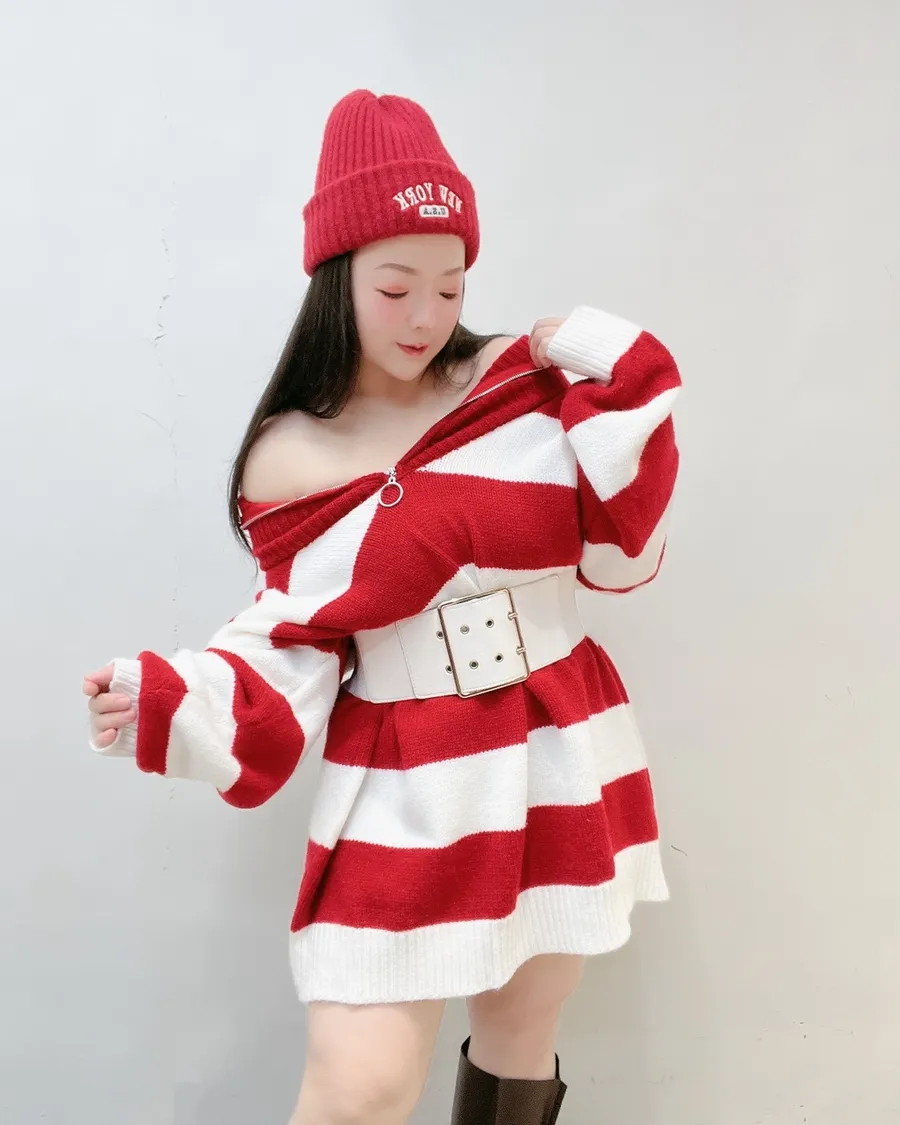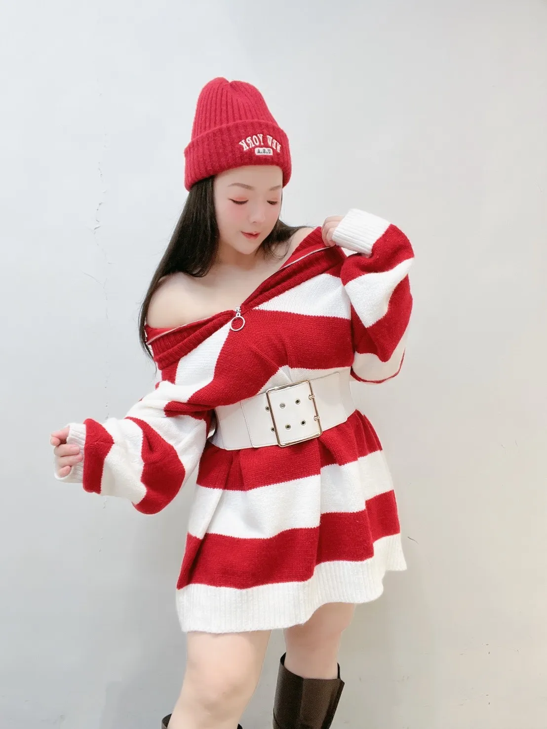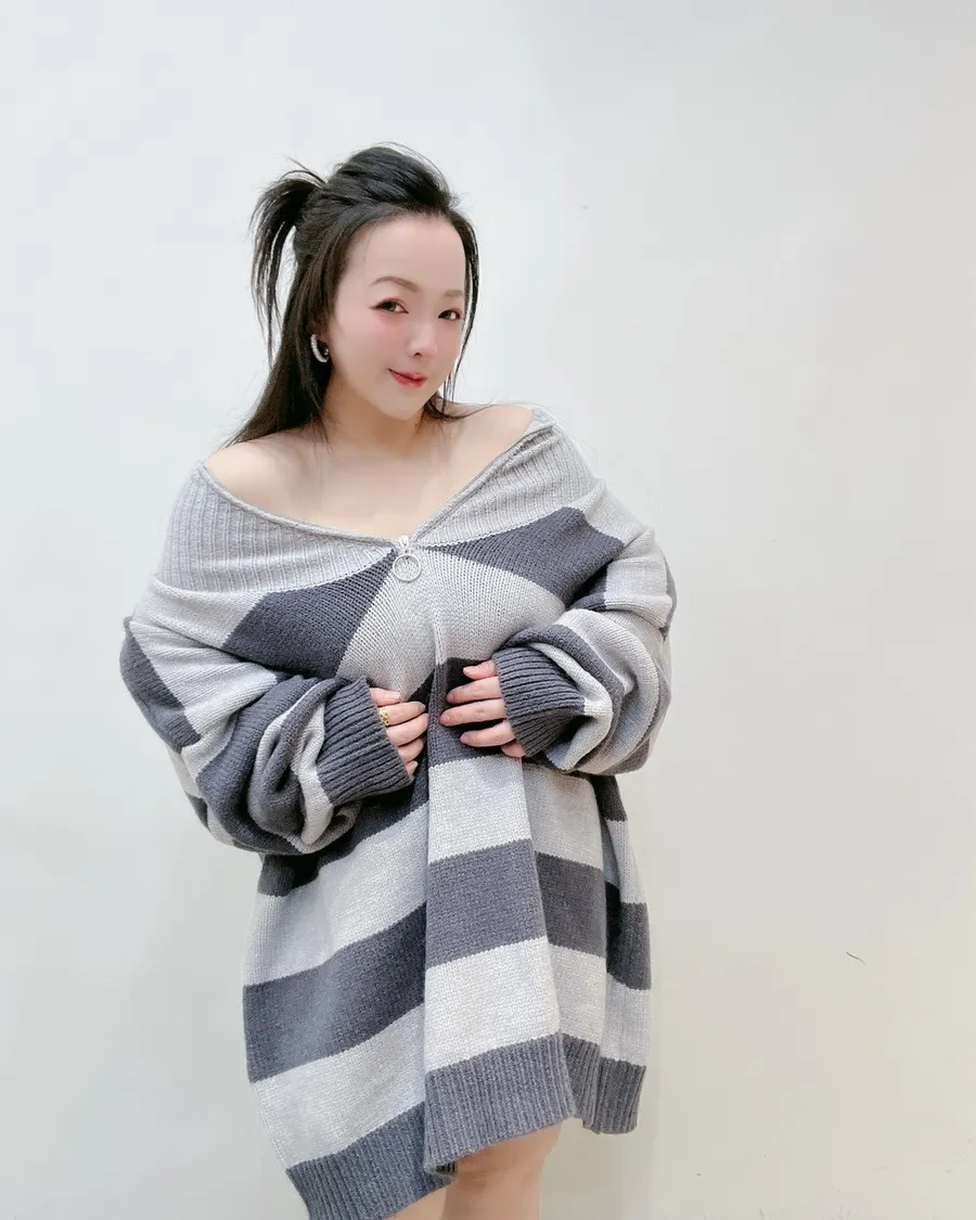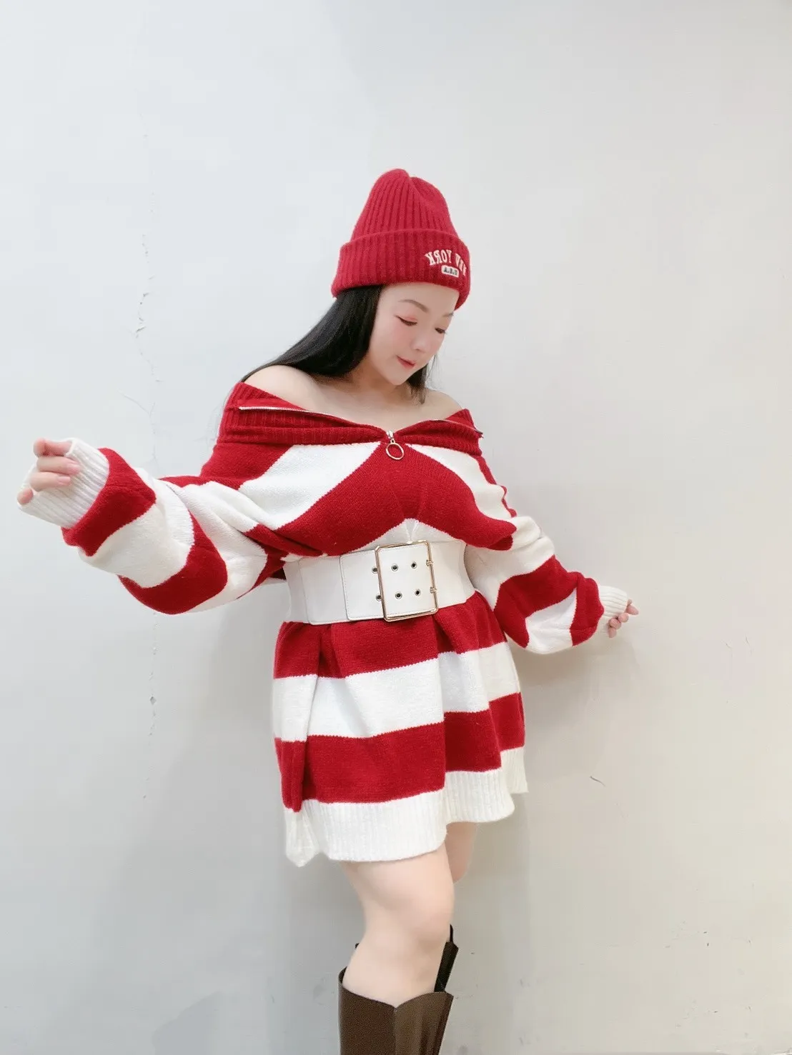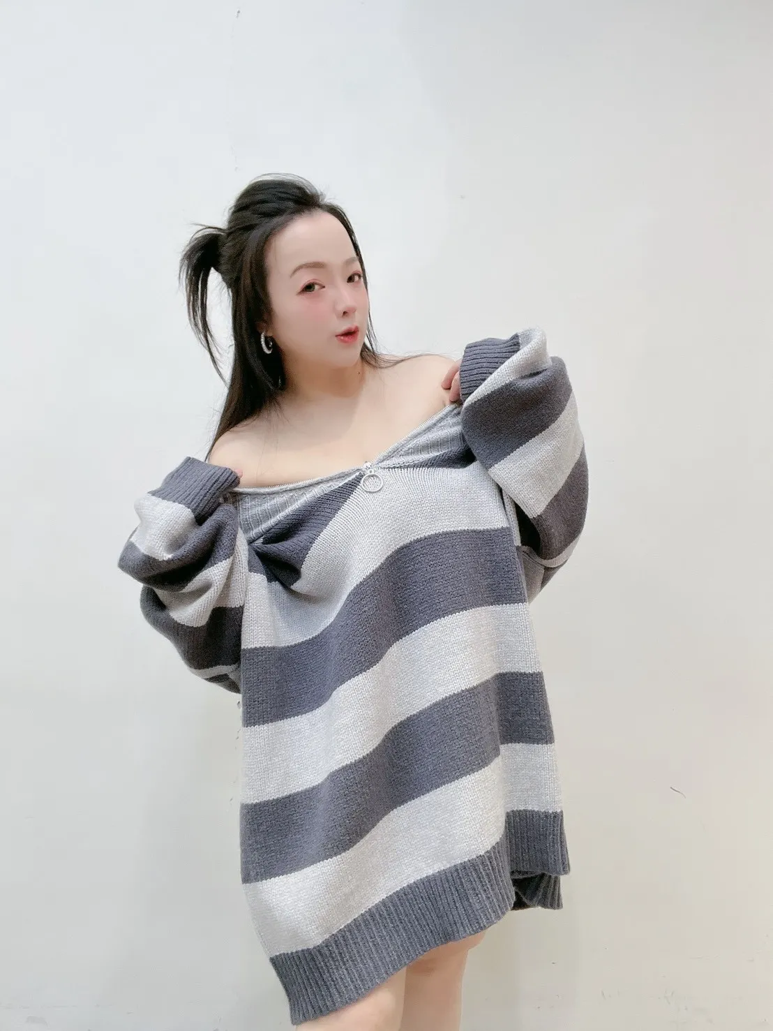 影片在這裡~寬條紋半拉鍊針織長版上衣