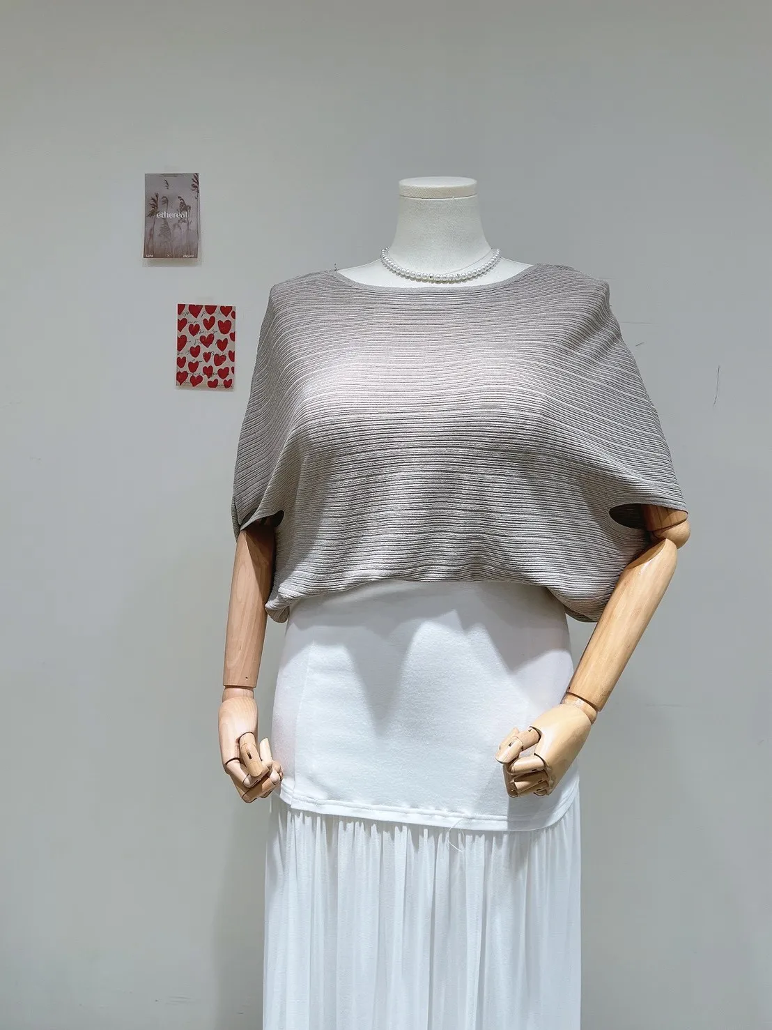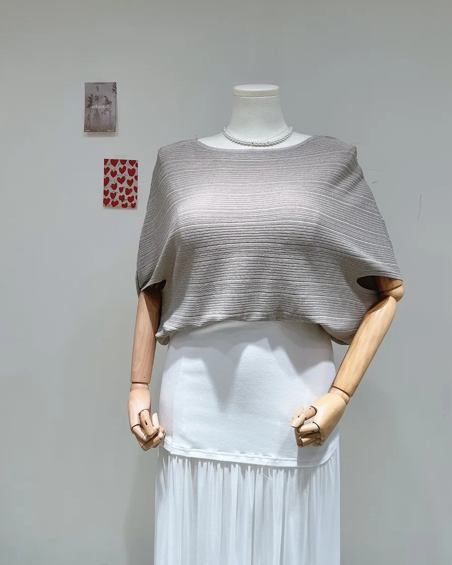 冰紗坑條面料帶有微微透感與紋理層次,搭配連袖設計,自然修飾肩線與手臂比例。