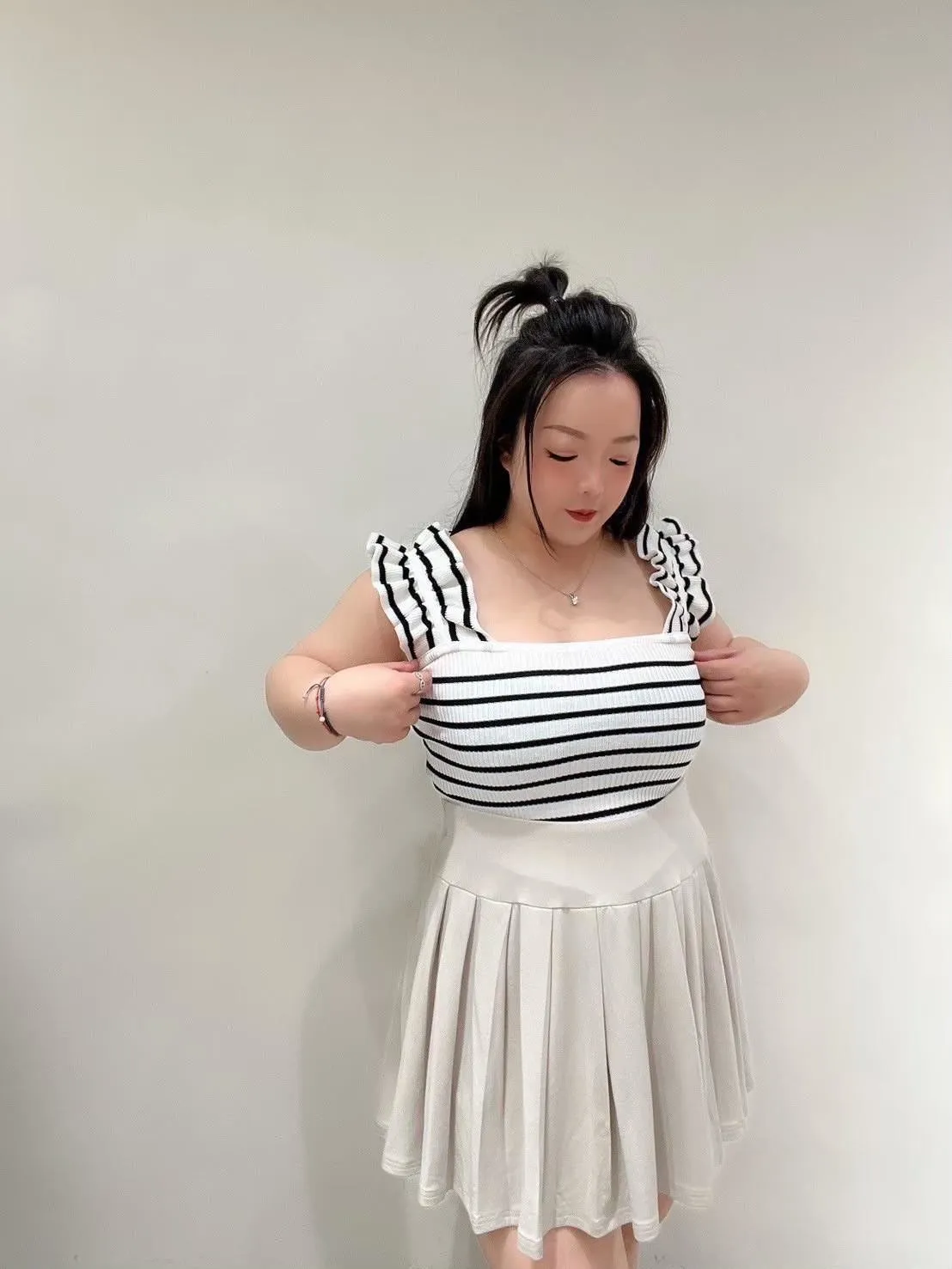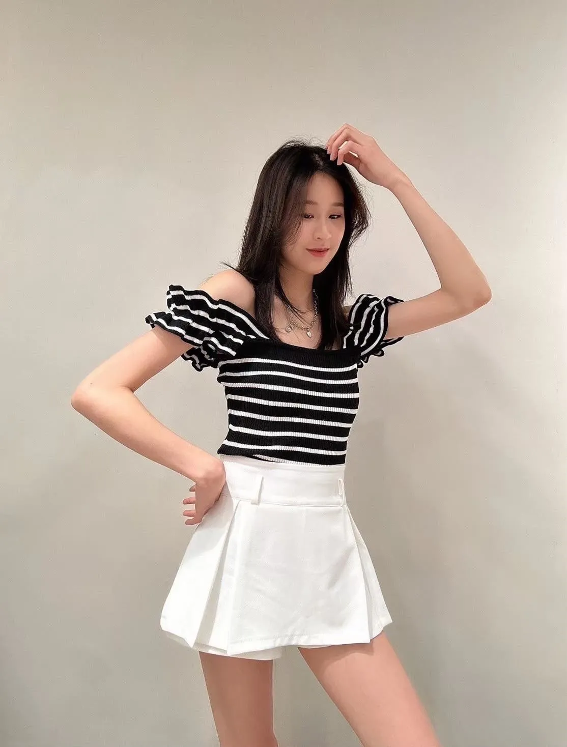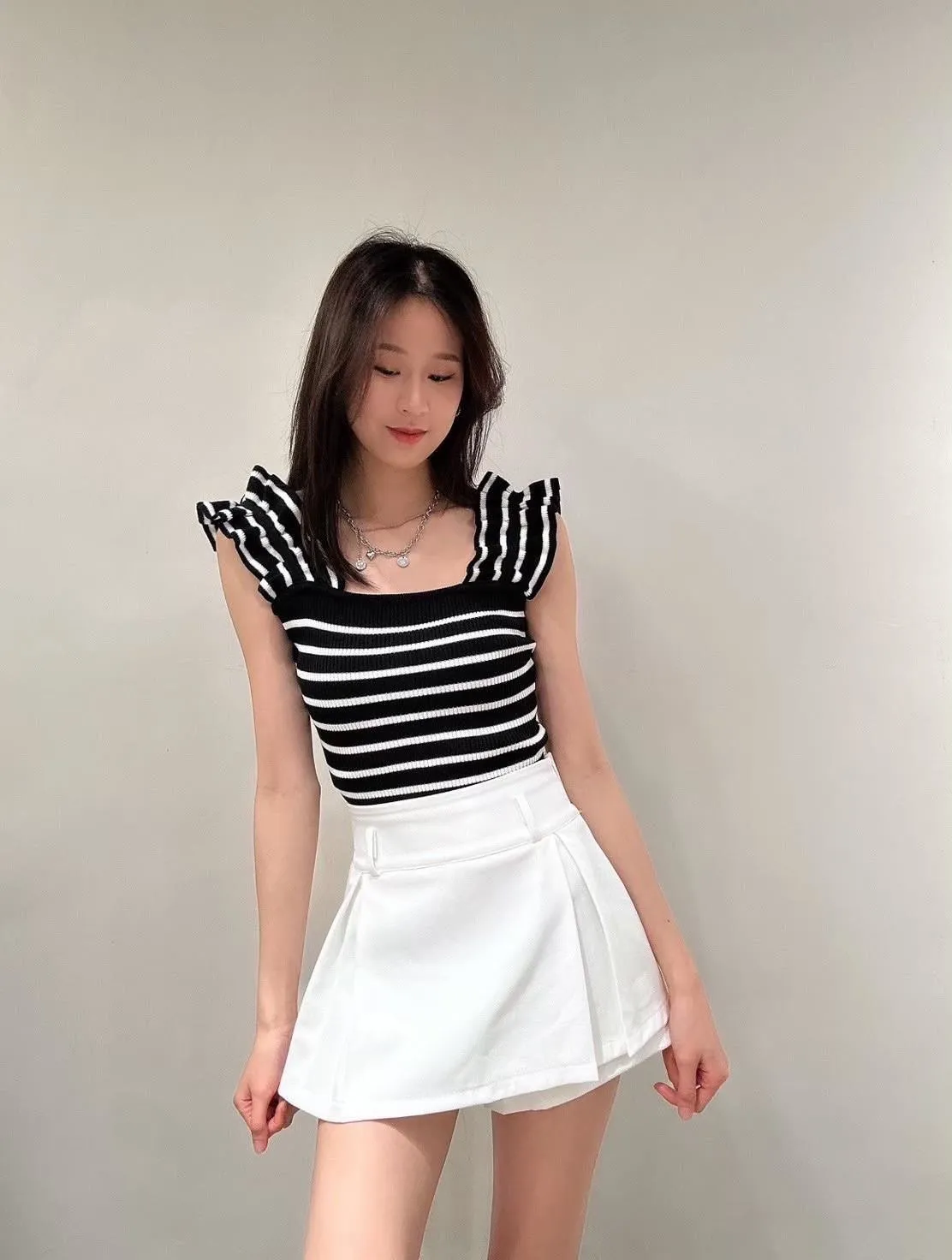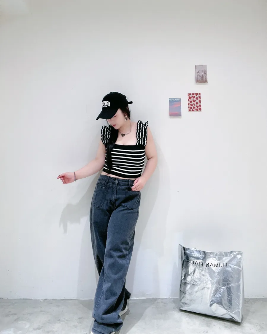 木耳邊肩帶設計,讓肩線看起來更柔和,搭配合身版型,自然勾出身形曲線但不會過度緊繃。