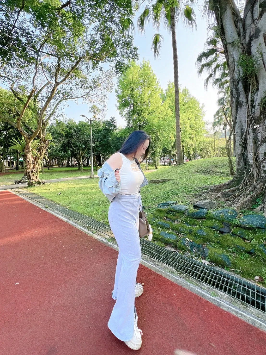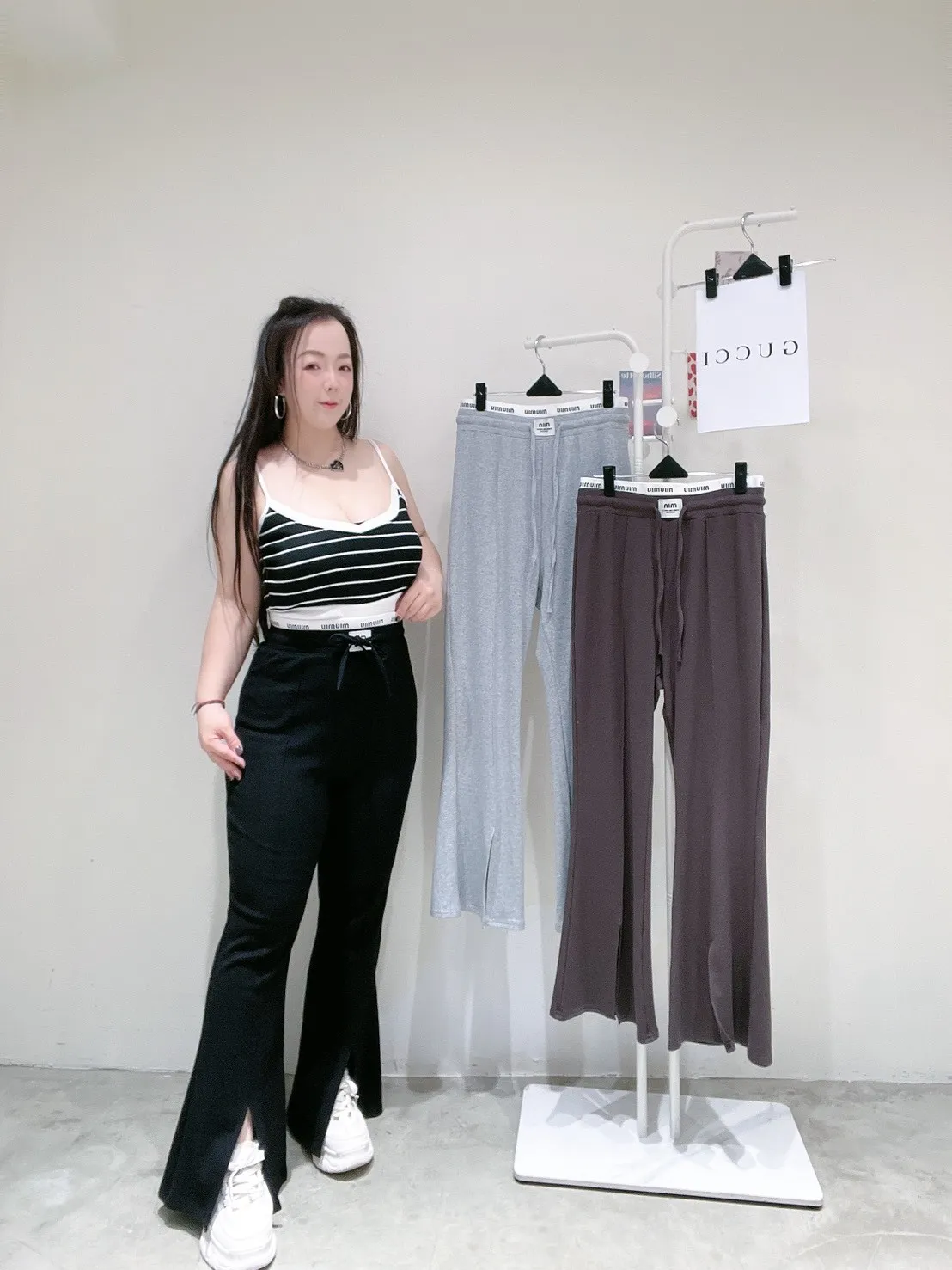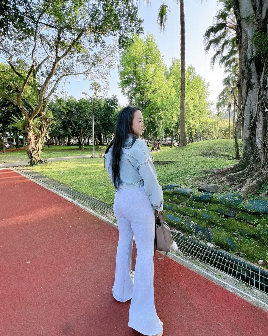 高腰設計搭配喇叭褲型,從腰到腿一路修順,